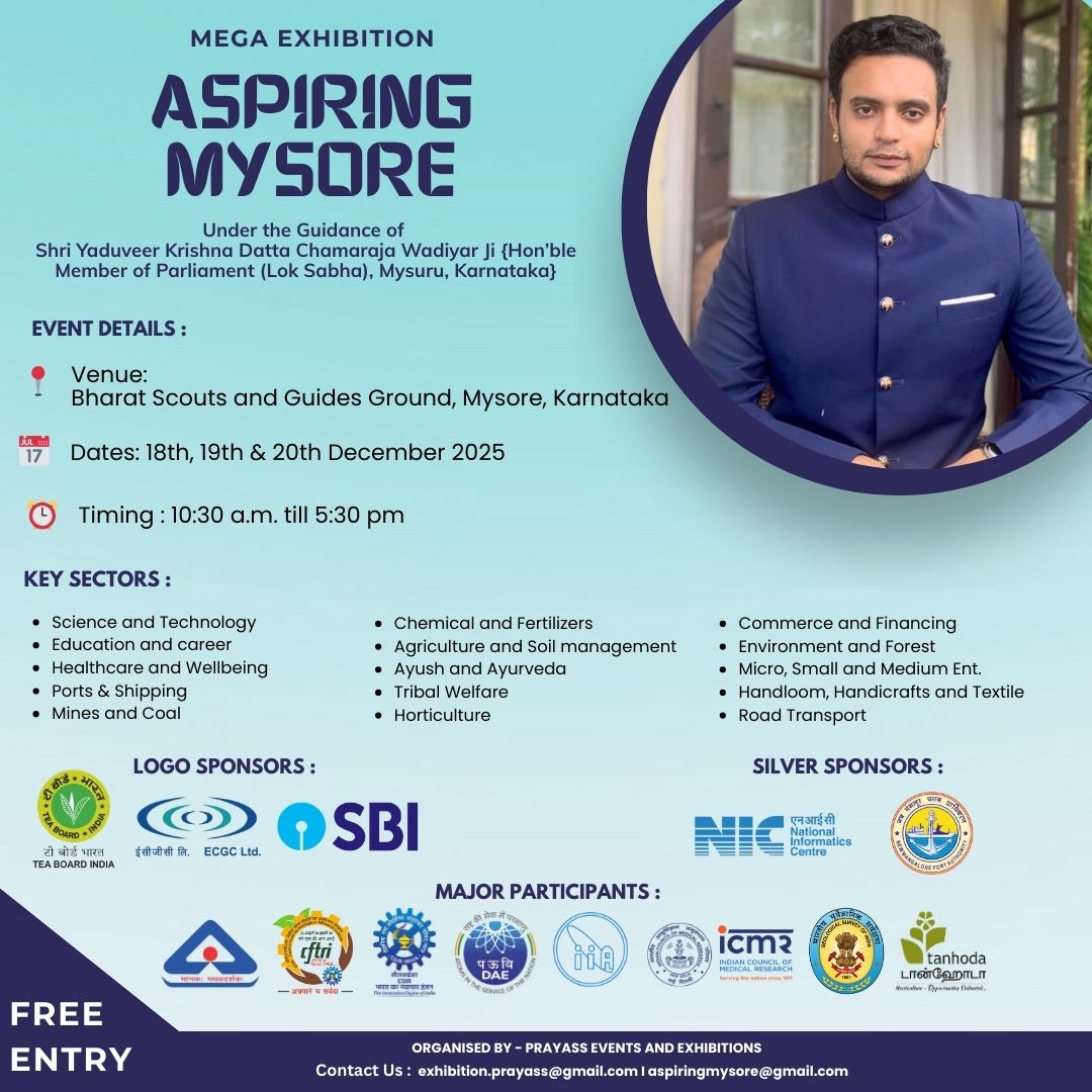 ಮೈಸೂರು ಡಿ.17 NEWS DESK : ಸಾಂಸ್ಕೃತಿಕ ರಾಜಧಾನಿ ಮೈಸೂರಿನಲ್ಲಿ ಡಿಸೆಂಬರ್ 18ರಿಂದ ಮೂರು ದಿನಗಳ ಕಾಲ “ಆಸ್ಪೈರಿಂಗ್ ಮೈಸೂರು” ಎಂಬ ಮೆಗಾ ಪ್ರದರ್ಶನ ನಡೆಯಲಿದೆ. ಮೈಸೂರು-ಕೊಡಗು ಲೋಕಸಭಾ ಕ್ಷೇತ್ರದ ಸಂಸದರಾದ ಯದುವೀರ್ ಕೃಷ್ಣದತ್ತ ಚಾಮರಾಜ ಒಡೆಯರ್ ನೇತೃತ್ವದಲ್ಲಿ ಈ ಮೆಗಾ ಪ್ರದರ್ಶನ ಆಯೋಜನೆಗೊಂಡಿದೆ. ಕೇಂದ್ರ ಸರ್ಕಾರದ ವಿವಿಧ ಯೋಜನೆಗಳು, ಸಾರ್ವಜನಿಕ ವಲಯದ ಉದ್ಯಮಗಳು, ವಿಕಸಿತ ಭಾರತ 2047 ಕುರಿತು ಜಾಗೃತಿ, ನಾವೀನ್ಯತೆ ಹಾಗೂ ಕೊಡುಗೆಗಳ ಬಗ್ಗೆ ಸಾರ್ವಜನಿಕರಿಗೆ ಮಾಹಿತಿ ದೊರೆಯಲಿದೆ. ಮೈಸೂರಿನ ಹಳೆಯ ಜಿಲ್ಲಾಧಿಕಾರಿಗಳ ಕಚೇರಿ ಹಿಂಭಾಗದಲ್ಲಿರುವ ಭಾರತ್ ಸ್ಕೌಟ್ಸ್ ಮತ್ತು ಗೈಡ್ಸ್ ಮೈದಾನದಲ್ಲಿ ಈ ಬೃಹತ್ ಪ್ರದರ್ಶನ ನಡೆಯಲಿದೆ. ಈ ಕುರಿತು ಹೆಚ್ಚಿನ ಮಾಹಿತಿ ನೀಡಿದ ಆಯೋಜಕರಾದ ವನೀಶ ಗುಪ್ತಾ, ಮೈಸೂರಿನ ನಾಗರಿಕರಿಗೆ ಇದೊಂದು ಸಮೃದ್ಧ ಮತ್ತು ಸಂವಾದಾತ್ಮಕ ವೇದಿಕೆಯಾಗಲಿದೆ ಎಂದರು. ವಿಜ್ಞಾನ-ತಂತ್ರಜ್ಞಾನ, ವಿದ್ಯುನ್ಮಾನ ಮತ್ತು ಮಾಹಿತಿ ತಂತ್ರಜ್ಞಾನ, ಪರಿಸರ, ಅರಣ್ಯ, ಹವಾಮಾನ ಬದಲಾವಣೆ, ಆರೋಗ್ಯ, ಬಂದರು, ಗಣಿಗಾರಿಕೆ, ಕರಕುಶಲ, ಜವಳಿ ಕ್ಷೇತ್ರದಲ್ಲಿನ ಪ್ರಗತಿ, ಯೋಜನೆಗಳ ಬಗ್ಗೆ ಸಮಗ್ರ ಮಾಹಿತಿ ಇಲ್ಲಿ ದೊರೆಯಲಿದೆ. ಮೂರು ದಿನಗಳ ಕಾಲ ಈ ಬೃಹತ್ ಪ್ರದರ್ಶನ ಬೆಳಗ್ಗೆ 10 ಗಂಟೆಯಿಂದ ಸಂಜೆ 5.30ರವರೆಗೆ ನಡೆಯಲಿದೆ. ಪ್ರವೇಶ ಉಚಿತವಾಗಿದೆ.