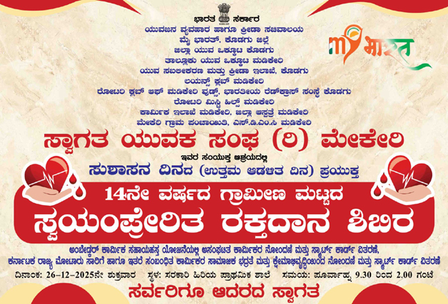 ಮಡಿಕೇರಿ ಡಿ.25 NEWS DESK : ಭಾರತ ಕಂಡ ಶ್ರೇಷ್ಠ ಪ್ರಧಾನಿ, ಅಜಾತಶತ್ರು, ಅಟಲ್ ಬಿಹಾರಿ ವಾಜಪೇಯಿ ಅವರ ಗೌರವಾರ್ಥ ಸುಶಾಸನ ದಿನ (ಉತ್ತಮ ಆಡಳಿತ ದಿನ)ದ ಅಂಗವಾಗಿ ಮೇಕೇರಿಯ ಸ್ವಾಗತ ಯುವಕ ಸಂಘ ಹಾಗೂ ವಿವಿಧ ಸಂಘ, ಸಂಸ್ಥೆಗಳ ಸಹಯೋಗದಲ್ಲಿ ಡಿ.26 ರಂದು 14ನೇ ಗ್ರಾಮೀಣ ಮಟ್ಟದ ಸ್ವಯಂ ಪ್ರೇರಿತ ರಕ್ತದಾನ ಶಿಬಿರ ನಡೆಯಲಿದೆ. ಯುವಜನ ವ್ಯವಹಾರ ಹಾಗೂ ಕ್ರೀಡಾ ಸಚಿವಾಲಯ, ಮೈ ಭಾರತ್, ಜಿಲ್ಲಾ ಯುವ ಒಕ್ಕೂಟ, ಮಡಿಕೇರಿ ತಾಲ್ಲೂಕು ಯುವ ಒಕ್ಕೂಟ, ಕೊಡಗು ಯುವ ಸಬಲೀಕರಣ ಮತ್ತು ಕ್ರೀಡಾ ಇಲಾಖೆ, ಮಡಿಕೇರಿ ಲಯನ್ಸ್ ಕ್ಲಬ್, ರೋಟರಿ ಕ್ಲಬ್ ಆಫ್ ಮಡಿಕೇರಿ ವುಡ್ಸ್, ಭಾರತೀಯ ರೆಡ್ಕ್ರಾಸ್ ಸಂಸ್ಥೆ, ರೋಟರಿ ಮಿಸ್ಟಿಹಿಲ್ಸ್, ಕಾರ್ಮಿಕ ಇಲಾಖೆ ಹಾಗೂ ಜಿಲ್ಲಾಸ್ಪತ್ರೆ ಮಡಿಕೇರಿ, ಮೇಕೇರಿ ಗ್ರಾಮ ಪಂಚಾಯಿತಿ ಮತ್ತು ಮಡಿಕೇರಿ ಎಸ್ಡಿಎಂಸಿ ಸಹಯೋಗದಲ್ಲಿ ನಡೆಯಲಿದೆ. ಬೆಳಿಗ್ಗೆ 9.30 ರಿಂದ ಮಧ್ಯಾಹ್ನ 2 ಗಂಟೆಯ ವರೆಗೆ ಮೇಕೇರಿಯ ಸರ್ಕಾರಿ ಹಿರಿಯ ಪ್ರಾಥಾರ್ಮಿಕ ಶಾಲೆಯಲ್ಲಿ ಶಿಬಿರ ನಡೆಯಲಿದ್ದು, ಸಾರ್ವಜನಿಕರು ಹಾಗೂ ರಕ್ತದಾನಿಗಳು ಹೆಚ್ಚಿನ ಸಂಖ್ಯೆಯಲ್ಲಿ ರಕ್ತದಾನ ಶಿಬಿರದಲ್ಲಿ ಪಾಲ್ಗೊಳ್ಳವಂತೆ ಸಂಘದ ಪ್ರಮುಖರು ಮನವಿ ಮಾಡಿದ್ದಾರೆ. ಅಲ್ಲದೇ ಶಿಬಿರದಲ್ಲಿ ಅಂಬೇಡ್ಕರ್ ಕಾರ್ಮಿಕ ಸಹಾಯಹಸ್ತ ಯೋಜನೆಯಲ್ಲಿ ಅಸಂಘಟಿತ ಕಾರ್ಮಿಕರ ನೋಂದಣಿ ಮತ್ತು ಸ್ಮಾರ್ಟ್ ಕಾರ್ಡ್ ವಿತರಣೆ, ಕರ್ನಾಟಕ ರಾಜ್ಯ ಮೋಟಾರು ಸಾರಿಗೆ ಹಾಗೂ ಇತರೆ ಸಂಬಂಧಿತ ಕಾರ್ಮಿಕರ ಸಾಮಾಜಿಕ ಭದ್ರತೆ ಮತ್ತು ಕ್ಷೇಮಾಭಿವೃದ್ಧಿಯಿಂದ ನೋಂದಣಿ ಮತ್ತು ಸ್ಮಾರ್ಟ್ ಕಾರ್ಡ್ ವಿತರಿಸಲಾಗುವುದೆಂದು ಪತ್ರಿಕಾ ಪ್ರಕಟಣೆಯಲ್ಲಿ ತಿಳಿಸಿದ್ದಾರೆ.