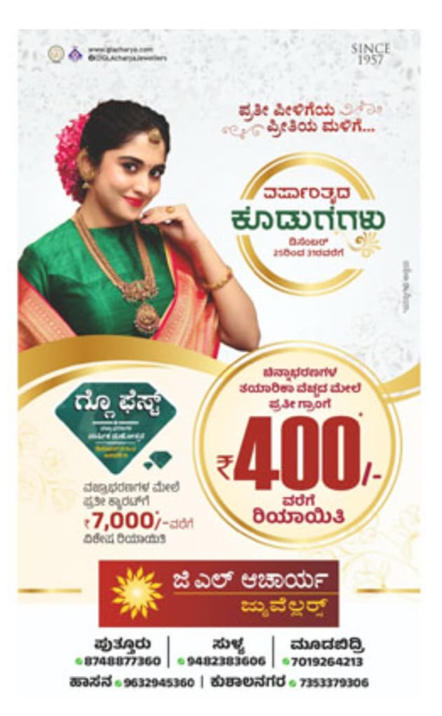 ಪುತ್ತೂರು ಡಿ.25 NEWS DESK : ಪುತ್ತೂರು ಮುಖ್ಯ ರಸ್ತೆಯಲ್ಲಿರುವ ಪ್ರತಿಷ್ಠಿತ ಚಿನ್ನಾಭರಣಗಳ ಮಳಿಗೆ ಜಿಎಲ್ ಆಚಾರ್ಯ ಜ್ಯುವೆಲ್ಲರ್ಸ್ ತನ್ನ ಗ್ರಾಹಕರಿಗೆ ವರ್ಷಾಂತ್ಯದ ಕೊಡುಗೆಗಳನ್ನು ಘೋಷಿಸಿದೆ. ಚಿನ್ನದ ಬೆಲೆ ಗಗನಮುಖಿಯಾಗುತ್ತಿರುವ ನಡುವೆ ಜಿಎಲ್ ಆಚಾರ್ಯ ಜ್ಯುವೆಲ್ಲರ್ಸ್ ಚಿನ್ನಾಭರಣಗಳ ತಯಾರಿಕಾ ವೆಚ್ಚದ (ಮೇಕಿಂಗ್ ಚಾರ್ಜ್) ಮೇಲೆ ಪ್ರತೀ ಗ್ರಾಂಗೆ 400 ರೂ. ವರೆಗೆ ರಿಯಾಯಿತಿ ನೀಡುತ್ತಿದೆ. ಈ ಕೊಡುಗೆ ಡಿ.25 ರಿಂದ ಪ್ರಾರಂಭವಾಗಿದ್ದು, ಡಿ.31ರ ವರೆಗೆ ಇರಲಿದೆ. ಹೆಚ್ಚಿನ ಮಾಹಿತಿಗಾಗಿ 8748877360 ಸಂಪರ್ಕಿಸುವಂತೆ ಪ್ರಕಟಣೆಯಲ್ಲಿ ತಿಳಿಸಲಾಗಿದೆ. ಈಗಾಗಲೇ ಸಂಸ್ಥೆಯಲ್ಲಿ ಗ್ಲೋ ಫೆಸ್ಟ್ ಎಂಬ ವಜ್ರಾಭರಣಗಳ ವಾರ್ಷಿಕ ಮಹೋತ್ಸವ ಡಿ.15 ರಿಂದ ನಡೆಯುತ್ತಿದ್ದು, ಜ.15ರ ವರೆಗೆ ಇರಲಿದೆ. ಅದರಂತೆ, ವಜ್ರಾಭರಣಗಳ ಮೇಲೆ ಪ್ರತಿ ಕ್ಯಾರೆಟ್ ಗೆ 7 ಸಾವಿರ ರೂ.ವರೆಗಿನ ವಿಶೇಷ ರಿಯಾಯಿತಿಯೊಂದಿಗೆ ವಜ್ರಾಭರಣಗಳನ್ನು ಖರೀದಿಸಬಹುದಾಗಿದೆ. ಈ ಎಲ್ಲಾ ಆಫರ್ಗಳು ಪುತ್ತೂರು ಮಾತ್ರವಲ್ಲದೆ, ಸುಳ್ಯ, ಮೂಡಬಿದ್ರಿ, ಹಾಸನ, ಕುಶಾಲನಗರದಲ್ಲಿನ ಜಿಎಲ್ ಆಚಾರ್ಯ ಜ್ಯುವೆಲ್ಲರ್ಸ್ ಮಳಿಗೆಗಳಲ್ಲಿಯೂ ಲಭ್ಯವಿದೆ.