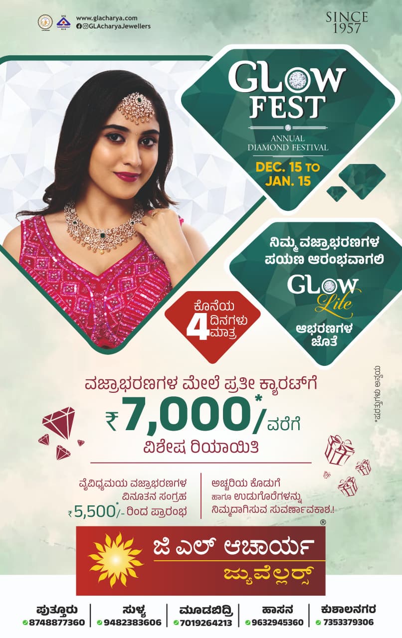 ಮಡಿಕೇರಿ ಜ.12 NEWS DESK : ಕುಶಾಲನಗರದ ಮುಖ್ಯರಸ್ತೆಯಲ್ಲಿರುವ ಪ್ರತಿಷ್ಟಿತ ಚಿನ್ನಾಭರಣಗಳ ಮಳಿಗೆ ಜಿ.ಎಲ್. ಆಚಾರ್ಯ ಜ್ಯುವೆಲ್ಲರ್ಸ್ ಪ್ರಸ್ತುತ ಪಡಿಸಿರುವ “ಗ್ಲೋಫೆಸ್ಟ್” ವಜ್ರಾಭರಣಗಳ ವಾರ್ಷಿಕ ಮಹೋತ್ಸವವು ಜ.15 ರಂದು ಕೊನೆಗೊಳ್ಳಲಿದೆ. ಹಾಗಾದ್ರೆ ಇನ್ಯಾಕೆ ತಡ… ಬೇಗ ಬೇಗ ಬನ್ನಿ ಕೊನೆಯ ನಾಲ್ಕು ದಿನಗಳ ಕಾಲಾವಕಾಶವನ್ನು ಸದುಪಯೋಗ ಪಡಿಸಿಕೊಳ್ಳಿ. ವಜ್ರಾಭರಣಗಳ ಮೇಲೆ ಪ್ರತೀ ಕ್ಯಾರೆಟ್ ರೂ.7000 ವರೆಗೆ ವಿಶೇಷ ರಿಯಾಯಿತಿ ನೀಡಲಾಗಿದೆ. ವೈವಿಧ್ಯಮಯ ವಜ್ರಾಭರಣಗಳ ವಿನೂತನ ಸಂಗ್ರಹವಿದ್ದು, ವಜ್ರಾಭರಣಗಳು ದುಬಾರಿ ಎಂದೇ ಭಾವನೆಯಲ್ಲಿರುವ ಜನರಿಗೆ ಕೈಗೆಟಕುವ ದರದಲ್ಲೂ ವಜ್ರಾಭರಣಗಳು ಲಭ್ಯವಿದೆ. ರೂ.3500 ರಿಂದ ವಜ್ರಾಭರಣದ ಬೆಲೆಗಳು ಪ್ರಾರಂಭವಾಗುತ್ತದೆ. ಗ್ಲೋ ವಜ್ರಾಭರಣಗಳು ಅಂತರಾಷ್ಟ್ರೀಯ ಪ್ರಯೋಗಾಲಯದಿಂದ ಪ್ರಮಾಣಿಕರಿಸಲ್ಪಟ್ಟ, ಉತ್ಕೃಷ್ಟ ಶ್ರೇಣಿಯ ಮೂಗುತಿ, ಪೆಂಡೆಂಟ್, ಉಂಗುರ, ಕಿವಿಯೋಲೆ ನೆಕ್ಲೇಸ್, ಬಳೆಗಳ ವಿವಿಧ ವಿನ್ಯಾಸಗಳ ಅಮೋಘ ಸಂಗ್ರಹವಿದೆ. ನುರಿತ ತಜ್ಞರಿಂದ ವಜ್ರಾಭರಣಗಳ ಬಗ್ಗೆ ಸಂಪೂರ್ಣ ಮಾಹಿತಿ, ಪ್ರತಿಷ್ಠಿತ ಪ್ರಮಾಣೀಕೃತ ಏಜೆನ್ಸಿಗಳಿಂದ ಧೃಡೀಕರಣಗೊಂಡ ವಜ್ರಾಭರಣಗಳ ಶ್ರೇಣಿ, ಪ್ರಮಾಣೀಕೃತ EF ಬಣ್ಣದ ಹಳೆಯ ವಜ್ರಾಭರಣಗಳ ವಿನಿಮಯ, ಮರುಖರೀದಿಯ ಗ್ಯಾರಂಟಿ, ಅಚ್ಚರಿಯ ಕೊಡುಗೆ ಹಾಗೂ ಉಡುಗೊರೆಗಳನ್ನು ತಮ್ಮದಾಗಿಸುವ ಸುವರ್ಣಾವಕಾಶವಿದೆ. ವಜ್ರದ ಆಭರಣಗಳು ತಮ್ಮ ಅಸಾಧಾರಣ ಸೌಂದರ್ಯ ಹಾಗೂ ದೀರ್ಘಕಾಲ ಬಾಳಿಕೆಯಿಂದ ಬಹಳ ಅಮೂಲ್ಯ ಆಭರಣಗಳು ಎಂದು ಪರಿಗಣಿಸಲ್ಪಟ್ಟಿವೆ. ಜಿ.ಎಲ್. ಆಚಾರ್ಯ ಜ್ಯುವೆಲ್ಲರ್ನಲ್ಲಿ ಸುಮಾರು 3,600ಕ್ಕೂ ಮಿಕ್ಕಿದ ಡಿಸೈನ್ಗಳಲ್ಲಿ ಕಣ್ಮನ ಸೆಳೆಯುವ ವಜ್ರಾಭರಣಗಳ ಅಮೋಘ ಸಂಗ್ರಹವಿದ್ದು, ಎಲ್ಲಾ ವಯೋಮಿತಿಯ ಗ್ರಾಹಕರಿಗೆ ತಕ್ಕಂತೆ ವಜ್ರಾಭರಣಗಳ ಆಯ್ಕೆ ಲಭ್ಯವಿದೆ. ಮಕ್ಕಳ, ಮಹಿಳೆಯರ ಹಾಗೂ ಪುರುಷರ ಅಭಿರುಚಿಗೆ ತಕ್ಕಂತೆ ವಿನ್ಯಾಸಗೊಳಿಸಿರುವ ವಜ್ರಾಭರಣಗಳು ಸಂಗ್ರಹವಿದ್ದು, ಗ್ರಾಹಕರಿಗೆ ಆಹ್ಲಾದಕರ ಖರೀದಿಯ ವಾತಾವರಣ ಕಲ್ಪಿಸಲಾಗಿದೆ. ಆಧುನಿಕ ಮತ್ತು ಪಾರಂಪರಿಕ ಚಿನ್ನದ ಆಭರಣಗಳು, ವಜ್ರಾಭರಣಗಳಿಗೆ ಹಾಗೂ ಗುಣಮಟ್ಟದ ಚಿನ್ನಾಭರಣಗಳ ಮಾರಾಟದಲ್ಲಿ ಹೆಸರುವಾಸಿಯಾಗಿರುವ ಸಂಸ್ಥೆಯು ಪುತ್ತೂರು, ಸುಳ್ಯ, ಮೂಡಬಿದ್ರೆ ಹಾಗೂ ಹಾಸನದಲ್ಲಿ ತಮ್ಮ ಮಳಿಗೆಗಳನ್ನು ಹೊಂದಿದೆ. ಈ ಆಫರ್ ನಮ್ಮ ಎಲ್ಲಾ ಮಳಿಗೆಗಳಲ್ಲಿ ಲಭ್ಯವಿದೆ ಎಂದು ಸಂಸ್ಥೆಯ ಪ್ರಕಟಣೆ ತಿಳಿಸಿದೆ.