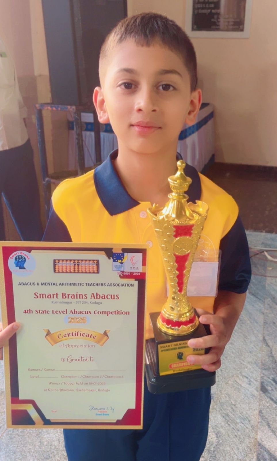 ವಿರಾಜಪೇಟೆ ಜ.29 NEWS DESK : ಕುಶಾಲನಗರದ ಸ್ಟಾರ್ಟ್ ಬ್ರೈನ್ ಅಕಾಡೆಮಿ ವತಿಯಿಂದ 4ನೇ ರಾಜ್ಯ ಮಟ್ಟದ ಅಬಾಕಸ್ ಸ್ಪರ್ಧೆಯಲ್ಲಿ ಮಹಮ್ಮದ್ ವೈಜ್ ಭಾಗವಹಿಸಿ ದ್ವಿತೀಯ ಸ್ಥಾನ ಪಡೆದುಕೊಂಡಿದ್ದಾನೆ. ಮಹಮ್ಮದ್ ವೈಜ್ ಅಮ್ಮತ್ತಿಯ ಗುಡ್ ಶೆಪರ್ಡ್ ಶಾಲೆಯಲ್ಲಿ 6ನೇ ತರಗತಿಯಲ್ಲಿ ವ್ಯಾಸಂಗ ಮಾಡುತ್ತಿದ್ದಾನೆ. ಮಹಮ್ಮದ್ ರಪೀಕ್ ಮತ್ತು ಸುಮಯ್ಯ ತಬಸ್ಸುಮ್ ಅವರ ಪುತ್ರ.