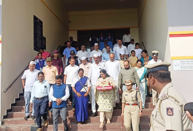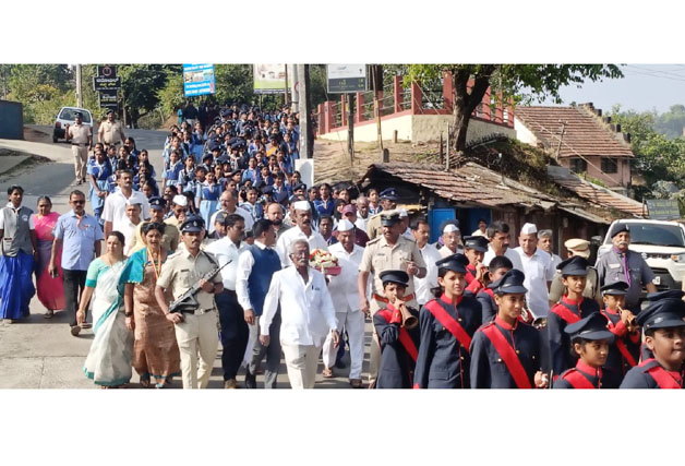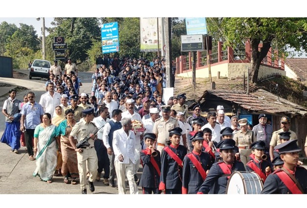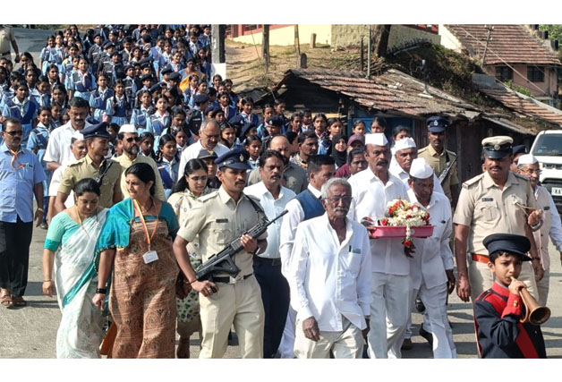 ಮಡಿಕೇರಿ ಜ.30 NEWS DESK : ಜಿಲ್ಲಾಡಳಿತ, ಕನ್ನಡ ಮತ್ತು ಸಂಸ್ಕೃತಿ ಇಲಾಖೆ, ನಗರಸಭೆ ಹಾಗೂ ಸರ್ವೋದಯ ಸಮಿತಿ ವತಿಯಿಂದ ‘ಹುತಾತ್ಮರ ದಿನಾಚರಣೆ’ ಮಡಿಕೇರಿಯಲ್ಲಿ ನಡೆಯಿತು. ನಗರದ ಜಿಲ್ಲಾಡಳಿತ ಭವನದ ಜಿಲ್ಲಾ ಖಜಾನೆಯಲ್ಲಿರಿಸಲಾಗಿದ್ದ ಮಹಾತ್ಮ ಗಾಂಧೀಜಿಯವರ ‘ಚಿತಾಭಸ್ಮ’ವನ್ನು ಹೊರತೆಗೆದು ಪುಷ್ಪಮಾಲೆಗಳಿಂದ ಶೃಂಗರಿಸಿ ಗೌರವ ಸಮರ್ಪಣೆ ಮಾಡಲಾಯಿತು. ಜಿಲ್ಲಾಡಳಿತ ಹಾಗೂ ಸರ್ವೋದಯ ಸಮಿತಿ ಸದಸ್ಯರ ನೇತೃತ್ವದಲ್ಲಿ ಪೊಲೀಸ್ ವಾದ್ಯದೊಂದಿಗೆ ನಗರದ ಮಂಗೇರಿರ ಮುತ್ತಣ್ಣ ಹಾಗೂ ಜನರಲ್ ತಿಮ್ಮಯ್ಯ ವೃತ್ತದ ಮುಖ್ಯ ರಸ್ತೆ ಮೂಲಕ ಗಾಂಧೀಜಿಯವರ ಚಿತಾಭಸ್ಮವನ್ನು ಕೊಂಡೊಯ್ದು ಗಾಂಧಿ ಮೈದಾನದಲ್ಲಿರಿಸಿ ಗಾಂಧೀ ಭಾವಚಿತ್ರಕ್ಕೆ ಮಾಲಾರ್ಪಣೆ ಮಾಡಿ ಗೌರವ ನಮನ ಸಮರ್ಪಿಸಲಾಯಿತು. ಇದೇ ವೇಳೆ ಪೊಲೀಸ್ ಮೀಸಲು ಪಡೆ ಮೂರು ಸುತ್ತುಗಳ ಕುಶಾಲತೋಪು ಹಾರಿಸುವ ಮೂಲಕ ರಾಷ್ಟ್ರಪಿತ ಮಹಾತ್ಮ ಗಾಂಧಿಗೆ ಗೌರವಾರ್ಪಣೆ ಸಲ್ಲಿಸಿ ಮೌನಾಚರಣೆ ಮಾಡಲಾಯಿತು. ನಂತರ ಸರ್ವಧರ್ಮ ಪ್ರಾರ್ಥನೆ ನಡೆಯಿತು, ಸರ್ವಧರ್ಮ ಗುರುಗಳು ಸಂದೇಶಗಳನ್ನು ಬೋಧಿಸಿದರು. ಸರ್ಕಾರಿ ಗೌರವಾರ್ಪಣೆ ಹಾಗೂ ಮೌನಾಚರಣೆಯ ನಂತರ ಮೆರವಣಿಗೆಯಲ್ಲಿ ಗಾಂಧೀಜಿ ಚಿತಾಭಸ್ಮವನ್ನು ಮತ್ತೆ ಜಿಲ್ಲಾ ಖಜಾನೆಯಲ್ಲಿಟ್ಟು ಭದ್ರಗೊಳಿಸಲಾಯಿತು. ಹೆಚ್ಚುವರಿ ಜಿಲ್ಲಾಧಿಕಾರಿ ಆರ್.ಐಶ್ವರ್ಯ, ಜಿಲ್ಲಾ ಪೊಲೀಸ್ ವರಿಷ್ಠಾಧಿಕಾರಿ ಆರ್.ಎನ್.ಬಿಂದುಮಣಿ, ಸರ್ವೋದಯ ಸಮಿತಿ ಅಧ್ಯಕ್ಷರಾದ ಅಂಬೆಕಲ್ಲು ಕುಶಾಲಪ್ಪ, ನಿಕಟ ಪೂರ್ವ ಅಧ್ಯಕ್ಷ ಟಿ.ಪಿ.ರಮೇಶ್, ಸರ್ವೋದಯ ಸಮಿತಿ ಪ್ರಧಾನ ಕಾರ್ಯದರ್ಶಿ ಮುನಿರ್ ಅಹ್ಮದ್, ಸದಸ್ಯರಾದ ಕೆ.ಟಿ.ಬೇಬಿ ಮ್ಯಾಥ್ಯು, ಪ್ರಕಾಶ್ ಆಚಾರ್ಯ, ತೆನ್ನೀರ ಮೈನಾ ಸೇರಿದಂತೆ ಪದಾಧಿಕಾರಿಗಳು ಹಾಗೂ ಅಧಿಕಾರಿಗಳು ಹಾಜರಿದ್ದು, ಮಹಾತ್ಮ ಗಾಂಧಿಗೆ ಗೌರವ ಅರ್ಪಿಸಿದರು.