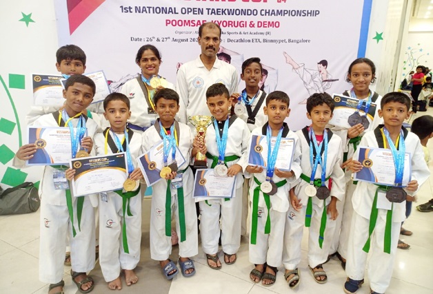 ಮಡಿಕೇರಿ ಆ.31 : ಕರ್ನಾಟಕ ಸ್ಪೋರ್ಟ್ಸ್ ಮತ್ತು ಆರ್ಟ್ಸ್ ಅಕಾಡೆಮಿ ವತಿಯಿಂದ ಬೆಂಗಳೂರಿನ ಬಿನ್ನಿಪೇಟೆಯ ಡೆಕತ್ಲಾನ್ ಇಟಿಎ ಮಹಲ್ ನಲ್ಲಿ ನಡೆದ ಅಂತರಾಜ್ಯ ಮಟ್ಟದ ಮುಕ್ತ ಟೆಕ್ವಾಂಡೊ ಚಾಂಪಿಯನ್ ಶಿಪ್ನಲ್ಲಿ ಕೊಡಗಿನ ಕೂರ್ಗ್ ಟೆಕ್ವಾಂಡೊ ತರಬೇತಿ ಕೇಂದ್ರದ ವಿದ್ಯಾರ್ಥಿಗಳು ಚಿನ್ನ, ಬೆಳ್ಳಿ ಹಾಗೂ ಕಂಚಿನ ಸಾಧನೆ ಮಾಡಿದ್ದಾರೆ.