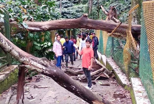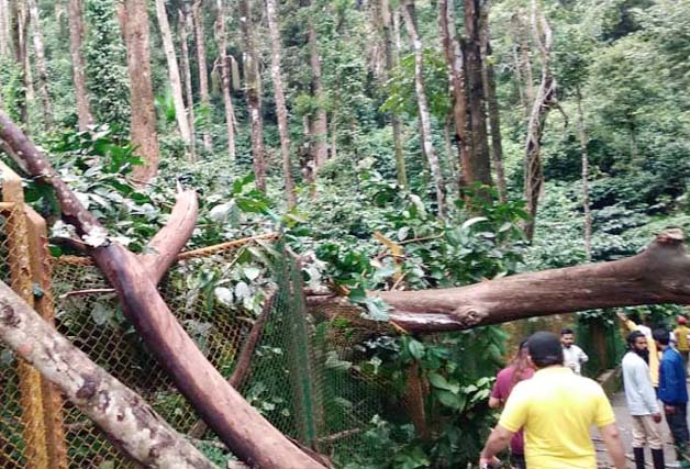 ಬೆಳಗ್ಗಿನಿಂದಲೇ ಜಲಧಾರೆ ವೀಕ್ಷಿಸಲು ಹೆಚ್ಚಿನ ಸಂಖ್ಯೆಯಲ್ಲಿ ಪ್ರವಾಸಿಗರು ಆಗಮಿಸುತ್ತಿದ್ದರು. ಈ ವೇಳೆ ಕಾಫಿ ತೋಟದಲ್ಲಿದ್ದ ಒಣ ಮರವೊಂದು ಏಕಾಏಕಿ ಮುರಿದು ರಸ್ತೆಗಡ್ಡಲಾಗಿ ಬಿದ್ದಿದೆ. ಮರ ಬಿದ್ದ ಸ್ಥಳದಿಂದ ಕೆಲವರು ಆಗಷ್ಟೇ ಮುಂದೆ ಸಾಗಿದ್ದರೆ, ಇನ್ನೂ ಕೆಲವರು ತರಾತುರಿಯಿಂದ ಜಲಧಾರೆಯನ್ನು ಕಣ್ತುಂಬಿಕೊಳ್ಳಲು ಬರುತ್ತಿದ್ದರು. ಅದೃಷ್ಟವಶಾತ್, ಮರ ಮಾರ್ಗಕ್ಕೆ ಅಡ್ಡಲಾಗಿ ಬೇಲಿಯ ಮೇಲೆ ಬಿದ್ದಿದ್ದರಿಂದ ಯಾವುದೇ ಅಪಾಯ ಸಂಭವಿಸಿಲ್ಲ.