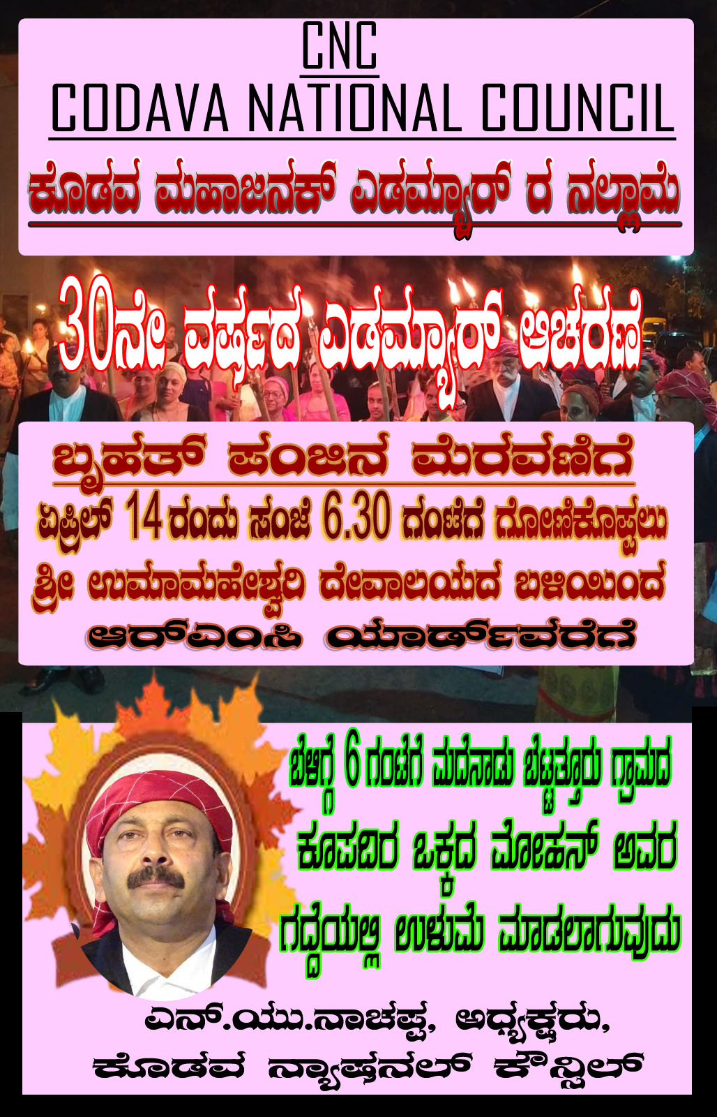 ಏ.14 ರಂದು ಸಂಜೆ 6.30ಗಂಟೆಗೆ ಗೋಣಿಕೊಪ್ಪಲಿನ ಶ್ರೀಉಮಾಮಹೇಶ್ವರಿ ದೇವಾಲಯದ ಬಳಿಯಿಂದ ದುಡಿಕೊಟ್ಟ್ ಪಾಟ್ ನೊಂದಿಗೆ ಕೊಡವ ಸಾಂಪ್ರದಾಯಿಕ ಉಡುಪಿನಲ್ಲಿ ಪಂಜಿನ ಮೆರವಣಿಗೆ ಸಾಗಿ ಆರ್ಎಂಸಿ ಯಾರ್ಡ್ ನಲ್ಲಿ ಕೊನೆಗೊಳ್ಳಲಿದೆ. ಆದಿಮಸಂಜಾತ ಕೊಡವ ಬುಡಕಟ್ಟು ಜನಾಂಗ ಕೊಡವರ ಹಕ್ಕುಗಳ ಕುರಿತು ಕಾರ್ಯಕ್ರಮದಲ್ಲಿ ಪ್ರತಿಪಾದನೆ ಮಾಡುವ ಮೂಲಕ ಆಡಳಿತ ವ್ಯವಸ್ಥೆ ಮತ್ತು ವಿಶ್ವದ ಗಮನ ಸೆಳೆಯಲಾಗುವುದು. ರಾಜ್ಯಾಂಗದತ್ತ ಹಕ್ಕೊತ್ತಾಯಗಳನ್ನು ಪ್ರಚುರಪಡಿಸಿ ಪ್ರತಿಜ್ಞಾ ವಿಧಿ ಸ್ವೀಕರಿಸಲಾಗುವುದು ಎಂದು ತಿಳಿಸಿದ್ದಾರೆ.