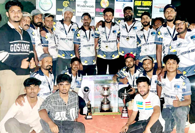 ಮಡಿಕೇರಿ ಫೆ.17 NEWS DESK : ಚಿಲ್ ಬಾಯ್ಸ್ ಮಡಿಕೇರಿ ಹಾಗೂ ಕೊಡಗು ಮುಸ್ಲಿಂ ಸ್ಪೋರ್ಟ್ಸ್ ಟ್ರಸ್ಟ್ ಇವರ ಆಶ್ರಯದಲ್ಲಿ, ಕಳೆದ ಒಂದು ವಾರಗಳಿಂದ ಮಡಿಕೇರಿ ನಗರದ ಕೆ.ಎಸ್ ಜನರಲ್ ತಿಮ್ಮಯ್ಯ ಕ್ರೀಡಾಂಗಣದಲ್ಲಿ ನಡೆದ 20ನೇ ವರ್ಷದ ಕೊಡಗು ಮುಸ್ಲಿಂ ಕಪ್ ಕ್ರಿಕೆಟ್ ಪಂದ್ಯಾವಳಿಯಲ್ಲಿ ಕುಶಾಲನಗರ ತಾಜ್ ತಂಡವು ಚಾಂಪಿಯನ್ ಪ್ರಶಸ್ತಿಯನ್ನು ಅಲಂಕರಿಸಿದೆ. ರನ್ನರ್ಸ್ ಪ್ರಶಸ್ತಿಯನ್ನು ಫ್ರೀಡಮ್ ಬಾಯ್ಸ್ ಹುಂಡಿ ತಂಡವು ಪಡೆದುಕೊಂಡಿತು. ಫೈನಲ್ ಪಂದ್ಯದಲ್ಲಿ ಮೊದಲು ಟಾಸ್ ಸೋತು ಬ್ಯಾಟ್ ಮಾಡಿದ ತಾಜ್ ಕುಶಾಲನಗರ ತಂಡವು ನಿಗದಿತ ಆರು ಓವರ್ ಗಳಲ್ಲಿ 49 ರನ್ ಗಳಿಸಿತು. 50 ರನ್ ಗಳ ಗುರಿ ಬೆನ್ನಟ್ಟಿದ ಫ್ರೀಡಮ್ ಬಾಯ್ಸ್ ಹುಂಡಿ ತಂಡವು ಕೊನೆಯ ಕ್ಷಣದವರೆಗೂ ಹೋರಾಟ ನಡೆಸಿದರು ಕೂಡ,ಫ್ರೀಡಮ್ ಬಾಯ್ಸ್ ಹುಂಡಿ 40 ರನ್ ಗಳಿಸಲಷ್ಟೇ ಶಕ್ತರಾದರು. ಅಂತಿಮವಾಗಿ ತಾಜ್ ಕುಶಾಲನಗರ ತಂಡವು 09 ರನ್ ಗಳ ಅಂತರದಿಂದ ಗೆಲುವು ಸಾಧಿಸಿ, 20ನೇ ವರ್ಷದ ಮುಸ್ಲಿಂ ಕಪ್ ಕ್ರಿಕೆಟ್ ಚಾಂಪಿಯನ್ ಪ್ರಶಸ್ತಿಯನ್ನು ಅಲಂಕರಿಸಿತು. ಫೈನಲ್ ಪಂದ್ಯದ ಮ್ಯಾನ್ ಆಫ್ ದಿ ಮ್ಯಾಚ್ ಪ್ರಶಸ್ತಿಯನ್ನು ತಾಜ್ ಕುಶಾಲನಗರ ತಂಡದ ತಶ್ರೀಫ್ ಪಡೆದುಕೊಂಡರು. ಇದಕ್ಕೂ ಮೊದಲು ನಡೆದ ಪ್ರಥಮ ಸೆಮಿಫೈನಲ್ ಪಂದ್ಯವು ಫ್ರೀಡಮ್ ಬಾಯ್ಸ್ ಹುಂಡಿ ಹಾಗೂ ಕೈವೈಸಿಸಿ ತಂಡಗಳ ನಡುವೆ ನಡೆಯಿತು. ಟಾಸ್ ಸೋತು ಮೊದಲು ಬ್ಯಾಟ್ ಮಾಡಿದ ಕೆವೈಸಿಸಿ ತಂಡವು ನಿಗದಿತ ಆರು ಓವರ್ ಗಳಲ್ಲಿ ಆರು ವಿಕೆಟ್ ನಷ್ಟಕ್ಕೆ 26 ರನ್ ಗಳಿಸಿದರು. ಫ್ರೀಡಮ್ ಬಾಯ್ಸ್ ಹುಂಡಿ ತಂಡದ ನಾಯಕ ರಿಯಾಸ್ (ಇಯ್ಯಾ) ಅವರ 20 ರನ್ ಗಳ ನೆರವಿನಿಂದ 1.1 ಓವರ್ ಗಳಲ್ಲಿ ಗುರಿ ಬೆನ್ನಟ್ಟಿ ಗೆಲುವು ಸಾಧಿಸಿ ಫೈನಲ್ ಪ್ರವೇಶಿಸಿತು.ಮೊದಲನೇ ಸೆಮಿಫೈನಲ್ ಪಂದ್ಯದಲ್ಲಿ ಫ್ರೀಡಮ್ ಬಾಯ್ಸ್ ಹುಂಡಿ ತಂಡದ ರಿಯಾಸ್ ಹುಂಡಿ ಪಡೆದುಕೊಂಡರು. ಎರಡನೇ ಸೆಮಿಫೈನಲ್ ಪಂದ್ಯವು ಆ್ಯಶಸ್ ಗೋಣಿಕೊಪ್ಪ ಹಾಗೂ ತಾಜ್ ಕುಶಾಲನಗರ ತಂಡಗಳ ನಡುವೆ ನಡೆಯಿತು. ನಿಗದಿತ ಆರು ಓವರ್ ಗಳಲ್ಲಿ ಒಂದು ವಿಕೆಟ್ ಕಳೆದುಕೊಂಡು 43 ರನ್ ಗಳಿಸಿದರು. 44 ರನ್ ಗಳ ಗುರಿಯನ್ನು ಬೆನ್ನಟ್ಟಿದ ಆ್ಯಶಸ್ ಗೋಣಿಕೊಪ್ಪ ತಂಡದ ತನ್ವೀರ್ ಚಿನ್ನು ಅವರ ಅಮೋಘವಾದ ಬ್ಯಾಟ್ ಮೂಲಕ ತಂಡವು ಸಮಬಲ ಸಾಧಿಸಿತು. ಸೆಮಿಫೈನಲ್ ಪಂದ್ಯವು ಡ್ರಾ ಆದ ಕಾರಣದಿಂದ ಸೂಪರ್ ಓವರ್ ನಡೆಯಿತು. ಸೂಪರ್ ಓವರ್ ನಲ್ಲಿ ಮೊದಲು ಬ್ಯಾಟ್ ಮಾಡಿದ ಆ್ಯಶಸ್ ಗೋಣಿಕೊಪ್ಪ ತಂಡವು ಎರಡು ವಿಕೆಟ್ ಕಳೆದುಕೊಂಡು 8 ರನ್ ಗಳಿಸಿತು. ಸೂಪರ್ ಓವರ್ ನಲ್ಲಿ ಗೆಲುವು ಸಾಧಿಸಿ ತಾಜ್ ಕುಶಾಲನಗರ ತಂಡವು ಫೈನಲ್ ಪ್ರವೇಶಿಸಿತು. ಎರಡನೇ ಸೆಮಿಫೈನಲ್ ಪಂದ್ಯದಲ್ಲಿ ತಾಜ್ ಕುಶಾಲನಗರ ತಂಡದ ರಜಾಕ್ ಮ್ಯಾನ್ ಆಫ್ ದಿ ಮ್ಯಾಚ್ ಪ್ರಶಸ್ತಿ ಪಡೆದರು. ಮೂರನೇ ಸ್ಥಾನಕ್ಕಾಗಿ ನಡೆದ ಆ್ಯಶಸ್ ಗೋಣಿಕೊಪ್ಪ ಹಾಗೂ ಕೆವೈಸಿಸಿ ಕಡಂಗ ತಂಡಗಳ ನಡುವಿನ ಪಂದ್ಯದಲ್ಲಿ ಟಾಸ್ ಸೋತು ಮೊದಲು ಬ್ಯಾಟ್ ಮಾಡಿದ ಆ್ಯಶಸ್ ತಂಡವು ನಿಗದಿತ ನಾಲ್ಕು ಓವರ್ ಗಳಲ್ಲಿ ಐದು ವಿಕೆಟ್ ಕಳೆದುಕೊಂಡು 43 ರನ್ ಗಳಿಸಿದರು. 44 ರನ್ ಗಳ ಗುರಿಯನ್ನು ಬೆನ್ನಟ್ಟಿದ ಕೆವೈಸಿಸಿ ತಂಡವು ಯಾವುದೇ ವಿಕೆಟ್ ನಷ್ಟವಿಲ್ಲದೆ ಮೂರನೇ ಓವರ್ ನಲ್ಲಿ ಗುರಿ ತಲುಪಿ ಮೂರನೇ ಸ್ಥಾನವನ್ನು ಕೆವೈಸಿಸಿ ಕಡಂಗ ತಂಡ ಪಡೆದುಕೊಂಡಿತು. ನಾಲ್ಕನೇ ಸ್ಥಾನಕ್ಕೆ ಆ್ಯಶಸ್ ಗೋಣಿಕೊಪ್ಪ ತಂಡ ತೃಪ್ತಿಪಟ್ಟುಕೊಂಡಿತ್ತು.