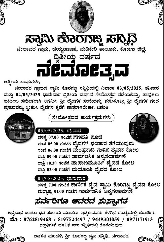 ಮಡಿಕೇರಿ ಏ.26 NEWS DESK : ಚೆಯ್ಯಂಡಾಣೆಯ ಚೇಲವಾರ ಗ್ರಾಮದ ಸ್ವಾಮಿ ಕೊರಗಜ್ಜ ಸನ್ನಿಧಿಯಲ್ಲಿ ಮೇ 3 ಮತ್ತು 4 ರಂದು ದ್ವಿತೀಯ ವರ್ಷದ ನೇಮೋತ್ಸವ ನಡೆಯಲಿದೆ. ಮೇ 3 ರಂದು ಬೆಳಿಗ್ಗೆ 7 ಗಂಟೆಗೆ ಗಣಪತಿ ಪೂಜೆ, ಸಂಜೆ 5 ಗಂಟೆಗೆ ದೈವಗಳ ಭಂಡಾರ ತೆಗೆಯುವುದು, 6 ಗಂಟೆಗೆ ಮಂತ್ರವಾದಿ ಗುಳಿಗ ದೈವದ ಕೋಲ, ರಾತ್ರಿ 9 ಗಂಟೆಗೆ ಸಾರ್ವಜನಿಕರಿಗೆ ಅನ್ನಸಂತರ್ಪಣೆ, 10.30 ಗಂಟೆಗೆ ಪಾಷಾಣಮೂರ್ತಿ ದೈವದ ಕೋಲ, ರಾತ್ರಿ 2 ಗಂಟೆಗೆ ಮಯೊಂತಿ ದೈವದ ಕೋಲ ಜರುಗಲಿದೆ. ಮೇ 4 ರಂದು ಬೆಳಿಗ್ಗೆ 7 ಗಂಟೆಗೆ ಕಾರ್ಣಿಕ ದೈವ ಸ್ವಾಮಿ ಕೊರಗಜ್ಜ ದೈವದ ಕೋಲ, ಮಧ್ಯಾಹ್ನ 1 ಗಂಟೆಗೆ ಸಾರ್ವಜನಿಕರಿಗೆ ಅನ್ನಸಂತರ್ಪಣೆ ನಡೆಯಲಿದ್ದು, ಭಕ್ತಾದಿಗಳು ಹೆಚ್ಚಿನ ಸಂಖ್ಯೆಯಲ್ಲಿ ಆಗಮಿಸಿ ಶ್ರೀ ದೈವಗಳ ಸೇವೆಯನ್ನು ನಡೆಸಿಕೊಟ್ಟು ಶ್ರೀ ದೈವಗಳ ಗಂಧ ಪ್ರಸಾದವನ್ನು ಸ್ವೀಕರಿಸಿ ದೈವಗಳ ಕೃಪೆಗೆ ಪಾತ್ರರಾಗಬೇಕಾಗಿ ಆಡಳಿತ ಮಂಡಳಿ ಪ್ರಕಟಣೆಯಲ್ಲಿ ತಿಳಿಸಿದೆ.