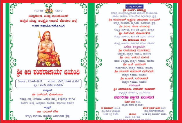 Facebook Twitter WhatsApp Email Telegram Copy Link ಮಡಿಕೇರಿ ಮೇ 1 NEWS DESK : ಜಿಲ್ಲಾಡಳಿತ, ಜಿಲ್ಲಾ ಪಂಚಾಯತ್, ಕನ್ನಡ ಮತ್ತು ಸಂಸ್ಕೃತಿ ಇಲಾಖೆ ಇವರ ಸಹಯೋಗದೊಂದಿಗೆ ಶ್ರೀ ಆದಿ ಶಂಕರಾಚಾರ್ಯ ಜಯಂತಿ ಕಾರ್ಯಕ್ರಮವು ಮೇ 2 ರಂದು ಬೆಳಗ್ಗೆ 11 ಗಂಟೆಗೆ ನಗರದ ಗಾಂಧಿ ಭವನದಲ್ಲಿ ನಡೆಯಲಿದೆ. ಗಣ್ಯರು ಪಾಲ್ಗೊಳ್ಳಲಿದ್ದಾರೆ.