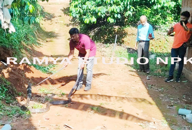 ನಾಪೋಕ್ಲು ಮೇ 6 NEWS DESK : ಕಕ್ಕಬೆಯ ನೆಟ್ಟುಮಾಡಿನಲ್ಲಿ ಬೃಹತ್ ಗಾತ್ರದ ಕಾಳಿಂಗ ಸರ್ಪವನ್ನು ಉರಗ ತಜ್ಞ ಪೊನ್ನಿರ ಸ್ನೇಕ್ ಗಗನ್ ರಕ್ಷಿಸಿದ್ದಾರೆ. ಗ್ರಾಮದ ನಿವಾಸಿ ವೈಕೋಲ್ ಉಸ್ಮಾನ್ ಅವರ ಮನೆಯ ಸಮೀಪದಲ್ಲಿದ್ದ ಬೃಹತ್ ಗಾತ್ರದ ಕಾಳಿಂಗ ಸರ್ಪ ಕಾಣಿಸಿಕೊಂಡಿದ್ದು, ಸ್ಥಳೀಯ ನಿವಾಸಿಗಳಾದ ಪಾಂಡ ನರೇಶ ಹಾಗೂ ರಘು ಮಾಹಿತಿ ನೀಡಿದ ಮೇರೆಗೆ ಸ್ಥಳಕ್ಕೆ ಆಗಮಿಸಿದ ಉರಗ ತಜ್ಞ ಪೊನ್ನಿರ ಸ್ನೇಕ್ ಗಗನ್ ಸುಮಾರು 12 ಅಡಿ ಉದ್ದದ ಕಾಳಿಂಗ ಸರ್ಪವನ್ನು ರಕ್ಷಿಸಿ ಅರಣ್ಯಕ್ಕೆ ಬಿಟ್ಟರು.