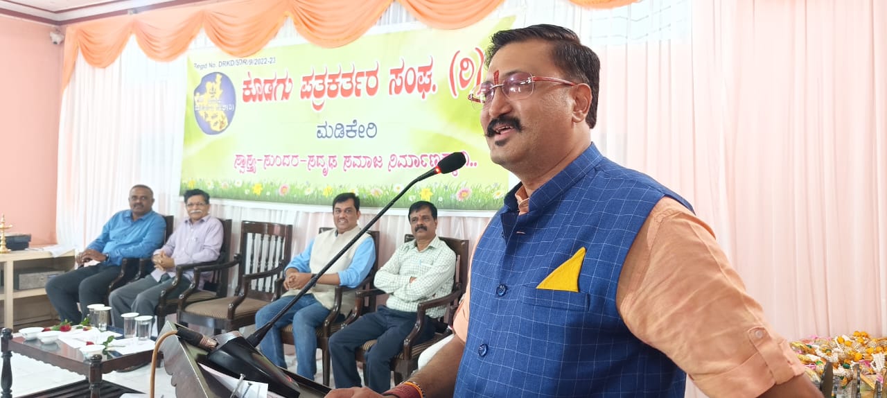 ಕೊಡಗು ಪತ್ರಕರ್ತರ ಸಂಘದ ವತಿಯಿಂದ ನಗರದ ಪತ್ರಿಕಾ ಭವನದ ಸಭಾಂಗಣದಲ್ಲಿ ನಡೆದ ‘ಪತ್ರಿಕಾ ದಿನಾಚರಣೆ’ ಹಾಗೂ ವಾರ್ಷಿಕ ಪ್ರಶಸ್ತಿ ಪದಾನ ಸಮಾರಂಭವನ್ನು ಉದ್ಘಾಟಿಸಿ ಅವರು ಮಾತನಾಡಿದರು. ಕೊಡಗು ಪತ್ರಕರ್ತರ ಸಂಘದ ‘ಸ್ವಾಸ್ಥ್ಯ, ಸುಂದರ, ಸಮಾಜ’ ಎನ್ನುವ ಘೋಷವಾಕ್ಯದಂತೆ ಪತ್ರಿಕಾ ಕ್ಷೇತ್ರವು ಸಮಾಜದ ಸ್ವಾಸ್ಥ್ಯವನ್ನು ಕಾಪಾಡುವ ಮೂಲಕ ಆರೋಗ್ಯಪೂರ್ಣ ಸಮಾಜ ನಿರ್ಮಾಣಕ್ಕೆ ಸದಾ ಶ್ರಮಿಸುತ್ತಿದೆ. ಸಮಾಜದ ಕಟ್ಟಕಡೆಯ ವ್ಯಕ್ತಿಗೂ ಬಲ ತುಂಬುವ ಮತ್ತು ಬೆಂಬಲವನ್ನು ನೀಡುವ ಕಾರ್ಯದ ಮೂಲಕ ಸುಂದರ ಸಮಾಜ ನಿರ್ಮಾಣ ಸಾಧ್ಯವಿದೆ ಎಂದರು.