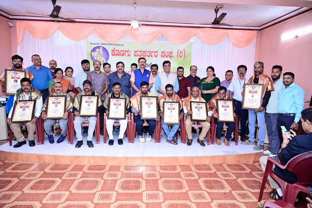 ಕೊಡಗು ಪತ್ರಕರ್ತರ ಸಂಘದ ಕ್ಷೇಮಾಭಿವೃದ್ಧಿ ಸಮಿತಿಯ ಅಧ್ಯಕ್ಷ ಜಿ.ವಿ.ರವಿಕುಮಾರ್ ಅವರು ಮಾತನಾಡಿ, ಪತ್ರಕರ್ತರಿಗೆ ಸಮಾಜದಲ್ಲಿ ಗೌರವವಿರುವುದರೊಂದಿಗೆ, ಅಷ್ಟೇ ಜವಾಬ್ದಾರಿಗಳೂ ಇದೆ. ಪತ್ರಿಕಾ ಕ್ಷೇತ್ರದಲ್ಲಿ ತೊಡಗಿಸಿಕೊಂಡಿರುವವರು ಇಂದಿನ ಕಾಲಘಟ್ಟಕ್ಕೆ ಅನುಗುಣವಾದ ಜ್ಞಾನವನ್ನು ಪಡೆದುಕೊಂಡು ಮುನ್ನಡೆಯುವುದರೊಂದಿಗೆ ಭಾಷಾ ಜ್ಞಾನವನ್ನು ಪಡೆಯುವುದು ಅತ್ಯವಶ್ಯವೆಂದು ತಿಳಿಸಿದರು. ಕೊಡಗು ಪತ್ರಕರ್ತರ ಸಂಘದ ಸ್ಥಾಪಕಾಧ್ಯಕ್ಷ ಎಸ್.ಎ.ಮುರಳೀಧರ್ ಮಾತನಾಡಿ, ಕೊಡಗನ ಶನಿವಾರಸಂತೆಯಲ್ಲಿ 142 ವರ್ಷಗಳ ಹಿಂದೆ ‘ಕೊಡಗು ಚಂದ್ರಿಕೆ’ ಪತ್ರಿಕೆಯ ಆರಂಭದೊಂದಿಗೆ ಜಿಲ್ಲೆಯಲ್ಲಿ ಪತ್ರಿಕಾ ಕ್ಷೇತ್ರ ಪಾದಾರ್ಪಣೆ ಮಾಡಿ ಮುನ್ನಡೆಯುತ್ತಾ ಬಂದಿದೆ. ಶನಿವಾರಸಂತೆ ಕೊಡಗಿನ ಪತ್ರಿಕಾ ಕ್ಷೇತ್ರದ ಆರಂಭಕ್ಕೆ ಕಾರಣವಾಗಿರುವಂತೆಯೇ, ಇದೇ ಊರು ಕೊಡಗಿನ ಹೆಮ್ಮೆಯ ಸೇನಾನಿ ಫೀ.ಮಾ.ಕಾರ್ಯಪ್ಪ ಅವರ ಹುಟ್ಟಿದ ಊರೂ ಆಗಿದೆಯೆಂದು ಸಂತಸ ವ್ಯಕ್ತಪಡಿಸಿದರು. ಇದೇ ಸಂದರ್ಭ ಅವರು ಸರ್ಕಾರ ಗ್ರಾಮೀಣ ಪತ್ರಕರ್ತರಿಗೆ ಉಚಿತ ಬಸ್ ಪಾಸ್ ವ್ಯವಸ್ಥೆ ಮಾಡಿದೆಯಾದರು, ಅದರಲ್ಲಿನ ನಿರ್ಬಂಧಗಳಿಂದ ಅದನ್ನು ಹೆಚ್ಚಿನವರು ಪಡೆಯಲು ಸಾಧ್ಯವಾಗದ ಸ್ಥಿತಿ ಇರುವುದಾಗಿ ಬೇಸರ ವ್ಯಕ್ತಪಡಿಸಿದರು. ಸಮಾರಂಭದ ಅಧ್ಯಕ್ಷತೆ ವಹಿಸಿ ಮಾತನಾಡಿದ ಕೊಡಗು ಪತ್ರಕರ್ತರ ಸಂಘದ ಅಧ್ಯಕ್ಷರಾದ ಅನಿಲ್ ಎಚ್.ಟಿ., ಪತ್ರಿಕಾ ಕ್ಷೇತ್ರ, ವಿವಿಧ ಕಾಲ ಘಟ್ಟಗಳಲ್ಲಿ ಹಲವು ಸವಾಲುಗಳನ್ನು ಎದುರಿಸಿಕೊಂಡು ಬರುತ್ತಿದೆ. ಮೊಬೈಲ್, ಇಂಟರ್ನೆಟ್ ಮೊದಲಾದ ಆಧುನಿಕ ವ್ಯವಸ್ಥೆಗಳ ನಡುವಿನ ಸವಾಲುಗಳನ್ನು ಪತ್ರಿಕೆ ಸಮರ್ಥವಾಗಿ ಎದುರಿಸಿ ಮುನ್ನಡೆದಿದೆ. ಪ್ರಸ್ತುತ ಕೃತಕ ಬುದ್ಧಿಮತ್ತೆಯ ಸವಾಲು ಪತ್ರಿಕಾ ಕ್ಷೇತ್ರದ ಮುಂದಿದೆಯಾದರು ಅದು ಅಷ್ಟಾಗಿ ಪತ್ರಿಕಾ ಕ್ಷೇತ್ರದ ಮೇಲೆ ಪ್ರಭಾವ ಬೀರಿಲ್ಲವೆಂದು ಅಭಿಪ್ರಾಯಪಟ್ಟರು. *ಪ್ರಶಸ್ತಿ ಪ್ರದಾನ*