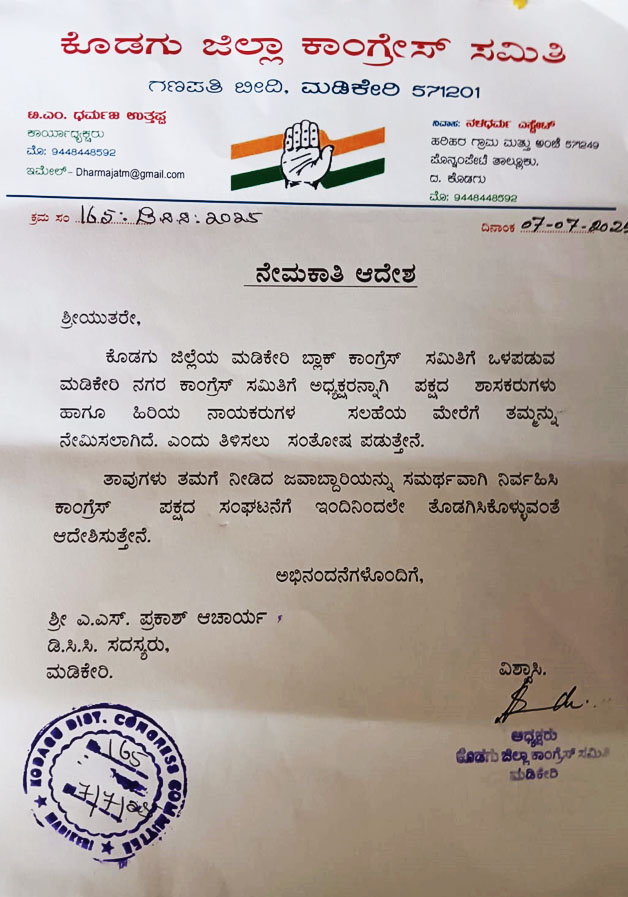 ಮಡಿಕೇರಿ ಜು.7 NEWS DESK : ಮಡಿಕೇರಿ ನಗರ ಕಾಂಗ್ರೆಸ್ ಸಮಿತಿಯ ಅಧ್ಯಕ್ಷರಾಗಿ ಎ.ಎಸ್.ಪ್ರಕಾಶ್ ಆಚಾರ್ಯ ಆಯ್ಕೆಯಾಗಿದ್ದಾರೆ. ನಗರದ ಜಿಲ್ಲಾ ಕಾಂಗ್ರೆಸ್ ಕಚೇರಿಯಲ್ಲಿ ಪಕ್ಷದ ಜಿಲ್ಲಾಧ್ಯಕ್ಷ ಧರ್ಮಜ ಉತ್ತಪ್ಪ ಅವರು ಪ್ರಕಾಶ್ ಆಚಾರ್ಯ ಅವರಿಗೆ ಆದೇಶ ಪತ್ರ ನೀಡಿ ನಗರದಲ್ಲಿ ಕಾಂಗ್ರೆಸ್ ಪಕ್ಷದ ಬಲವರ್ಧನೆಗೆ ಶ್ರಮಿಸುವಂತೆ ಸೂಚನೆ ನೀಡಿದರು. ಈ ಸಂದರ್ಭ ಜಿಲ್ಲಾ ಕಾಂಗ್ರೆಸ್ ಗೌರವ ಕಾರ್ಯದರ್ಶಿ ವಿ.ಪಿ.ಸುರೇಶ್, ಪ್ರಧಾನ ಕಾರ್ಯದರ್ಶಿಗಳಾದ ಕೊಲ್ಯದ ಗಿರೀಶ್, ಎಸ್.ಐ.ಮುನೀರ್ ಅಹಮ್ಮದ್, ನಗರಸಭಾ ನಾಮ ನಿರ್ದೇಶಿತ ಸದಸ್ಯ ಸದಾ ಮುದ್ದಪ್ಪ ಮತ್ತಿತರರು ಉಪಸ್ಥಿತರಿದ್ದರು.