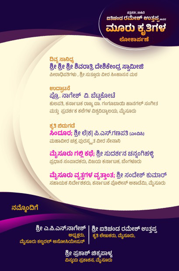ಇನ್ನು ಕಾರ್ಯಕ್ರಮದಲ್ಲಿ ಮೈಸೂರು ಕಲ್ಚರಲ್‌ ಅಸೋಸಿಯೇಶನ್‌ ಅಧ್ಯಕ್ಷ ಎ.ಪಿ.ನಾಗೇಶ್‌, ಮೂರು ಕೃತಿಗಳ ಲೇಖಕಕ ಐತಿಚಂಡ ರಮೇಶ್‌ ಉತ್ತಪ್ಪ, ವಿಸ್ಮಯ ಪ್ರಕಾಶನದ ಪ್ರಕಾಶ್‌ ಚಿಕ್ಕಪಾಳ್ಯ ಉಪಸ್ಥಿತರಿರುತ್ತಾರೆ.
