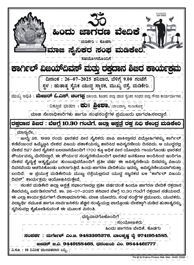 ಮಡಿಕೇರಿ ಜು.24 NEWS DESK : ಕೊಡಗು ಹಿಂದು ಜಾಗರಣ ವೇದಿಕೆ ಮತ್ತು ಮಡಿಕೇರಿ ಮಾಜಿ ಸೈನಿಕರ ಸಂಘದ ಸಹಯೋಗದಲ್ಲಿ ಜು.26 ರಂದು ಮಡಿಕೇರಿಯಲ್ಲಿ ಕಾರ್ಗಿಲ್ ವಿಜಯ್ ದಿವಸ್ ಮತ್ತು ರಕ್ತದಾನ ಶಿಬಿರ ನಡೆಯಲಿದೆ. ಅಂದು ಬೆಳಿಗ್ಗೆ 9 ಗಂಟೆಗೆ ನಗರದ ಮುಖ್ಯ ರಸ್ತೆಯಲ್ಲಿರುವ ಹುತಾತ್ಮ ಸೈನಿಕ ಯುದ್ಧ ಸ್ಮಾರಕದಲ್ಲಿ ಕಾರ್ಗಿಲ್ ಯುದ್ಧದಲ್ಲಿ ದಿಗ್ವಿಜಯ ಸಾಧಿಸಿದ ಭಾರತೀಯ ಯೋಧರ ತ್ಯಾಗ ಬಲಿದಾನಗಳನ್ನು ಸ್ಮರಿಸಿ, ಯೋಧರಿಗೆ ಪುಪ್ಪನಮನ ಸಲ್ಲಿಸಲಾಗುವುದು. ಕಾರ್ಯಕ್ರಮಕ್ಕೆ ಕೊಡಗು ಜಿಲ್ಲಾ ಮಾಜಿ ಸೈನಿಕರ ಸಂಘದ ಜಿಲ್ಲಾ ಕಾರ್ಯದರ್ಶಿ ಹಾಗೂ ವಕೀಲರಾದ ಮೇಜರ್ ಓ.ಎಸ್.ಚಿಂಗಪ್ಪ ಮುಖ್ಯ ಅತಿಥಿಗಳಾಗಿ ಪಾಲ್ಗೊಳ್ಳಲಿದ್ದು, ಬಾಲವಾಗ್ಮಿ ಶ್ರೀಶಾ ದಿಕ್ಸೂಚಿ ಭಾಷಣ ಮಾಡಲಿದ್ದಾಳೆ. ಮಾಜಿ ಸೇನಾಧಿಕಾರಿಗಳು ಹಾಗೂ ವಿವಿಧ ಸಂಘ ಸಂಸ್ಥೆಗಳ ಪ್ರಮುಖರು ಭಾಗವಹಿಸಲಿದ್ದಾರೆ. ಬೆಳಿಗ್ಗೆ 10.30 ಗಂಟೆಗೆ ನಗರದ ಜಿಲ್ಲಾಸ್ಪತ್ರೆಯ ರಕ್ತ ನಿಧಿ ಕೇಂದ್ರದಲ್ಲಿ ರಕ್ತದಾನ ಶಿಬಿರ ನಡೆಯಲಿದ್ದು, ದೇಶಾಭಿಮಾನಿಗಳು, ಮಾಜಿ ಯೋಧರು, ಸಂಘ, ಸಂಸ್ಥೆಗಳ ಪ್ರಮುಖರು, ಯುವಕರು, ವಿದ್ಯಾರ್ಥಿಗಳು, ಸಮೂಹ ಹಾಗೂ ಸಾರ್ವಜನಿಕರು ಹೆಚ್ಚಿನ ಸಂಖ್ಯೆಯಲ್ಲಿ ಪಾಲ್ಗೊಳ್ಳುವಂತೆ ಹಿಂದು ಜಾಗರಣ ವೇದಿಕೆ ಕೋರಿದೆ.