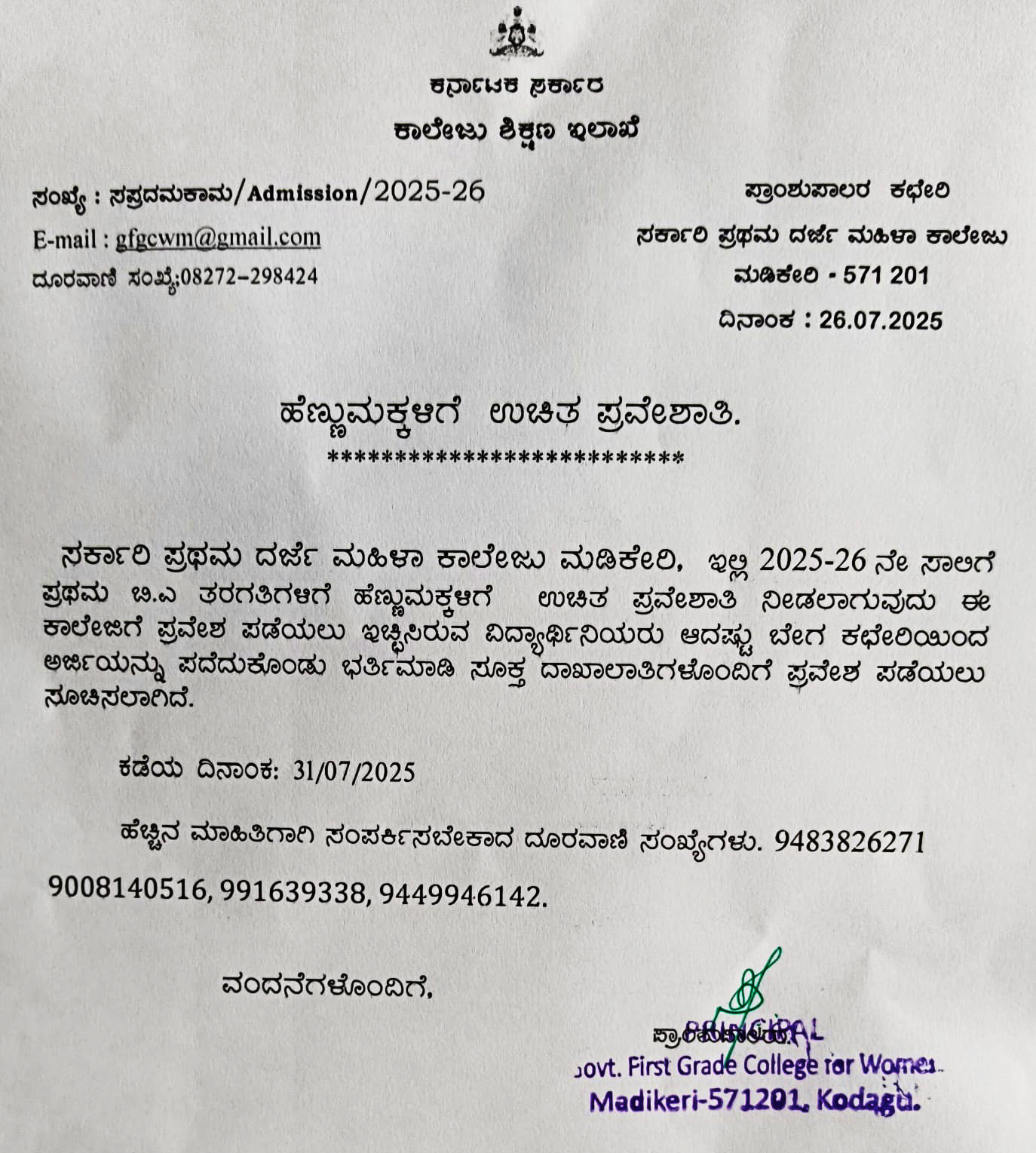 ಮಡಿಕೇರಿ ಜು.26 NEWS DESK : ಮಡಿಕೇರಿ ಸರ್ಕಾರಿ ಪ್ರಥಮ ದರ್ಜೆ ಮಹಿಳಾ ಕಾಲೇಜಿನಲ್ಲಿ 2025-26 ನೇ ಸಾಲಿಗೆ ಪ್ರಥಮ ಬಿ.ಎ ತರಗತಿಗಳಿಗೆ ಹೆಣ್ಣುಮಕ್ಕಳಿಗೆ ಉಚಿತ ಪ್ರವೇಶಾತಿ ನೀಡಲಾಗುವುದು. ಈ ಕಾಲೇಜಿಗೆ ಪ್ರವೇಶ ಪಡೆಯಲು ಇಚ್ಛಿಸಿರುವ ವಿದ್ಯಾರ್ಥಿನಿಯರು ಕಛೇರಿಯಿಂದ ಅರ್ಜಿಯನ್ನು ಪಡೆದುಕೊಂಡು ಭರ್ತಿಮಾಡಿ ಸೂಕ್ತ ದಾಖಾಲಾತಿಗಳೊಂದಿಗೆ ಪ್ರವೇಶ ಪಡೆಯಲು ಸೂಚಿಸಲಾಗಿದೆ. ಅರ್ಜಿ ಸಲ್ಲಿಸಲು 31/07/2025 ಕಡೆಯ ದಿನ ಹೆಚ್ಚಿನ ಮಾಹಿತಿಗಾಗಿ ಸಂಪರ್ಕಿಸಬೇಕಾದ ದೂರವಾಣಿ ಸಂಖ್ಯೆಗಳು. 9483826271 9008140516, 991639338, 9449946142.