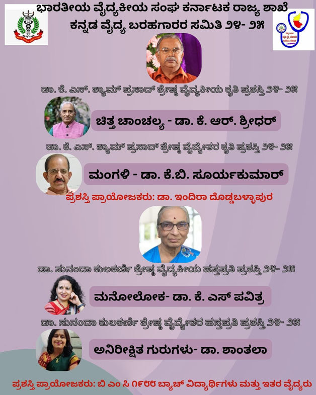 ಮಡಿಕೇರಿ ಜು.30 NEWS DESK : ಭಾರತೀಯ ವೈದ್ಯಕೀಯ ಸಂಘ ಕರ್ನಾಟಕ ರಾಜ್ಯ ಶಾಖೆ, ಕನ್ನಡ ವೈದ್ಯ  ಬರಹಗಾರರ ಸಮಿತಿ ವತಿಯಿಂದ ನೀಡಲಾಗುವ ರಾಜ್ಯಮಟ್ಟದ ಪ್ರಶಸ್ತಿಗೆ ಕೊಡಗಿನ ಹಿರಿಯ ವೈದ್ಯ, ಸಾಹಿತಿ ಡಾ. ಕೆ.ಬಿ.ಸೂರ್ಯಕುಮಾರ್‌ ಭಾಜನರಾಗಿದ್ದಾರೆ.  ಸೂರ್ಯಕುಮಾರ್‌ ಅವರು ಬರೆದ ಮಂಗಳಿ ಕೃತಿಗೆ ಡಾ. ಕೆ.ಎಸ್.ಶ್ಯಾಮ್‌ಪ್ರಸಾದ್‌ ಶ್ರೇಷ್ಠ ವೈದ್ಯೇತರ ಕೃತಿ ಪ್ರಶಸ್ತಿ ಲಭಿಸಿದೆ.