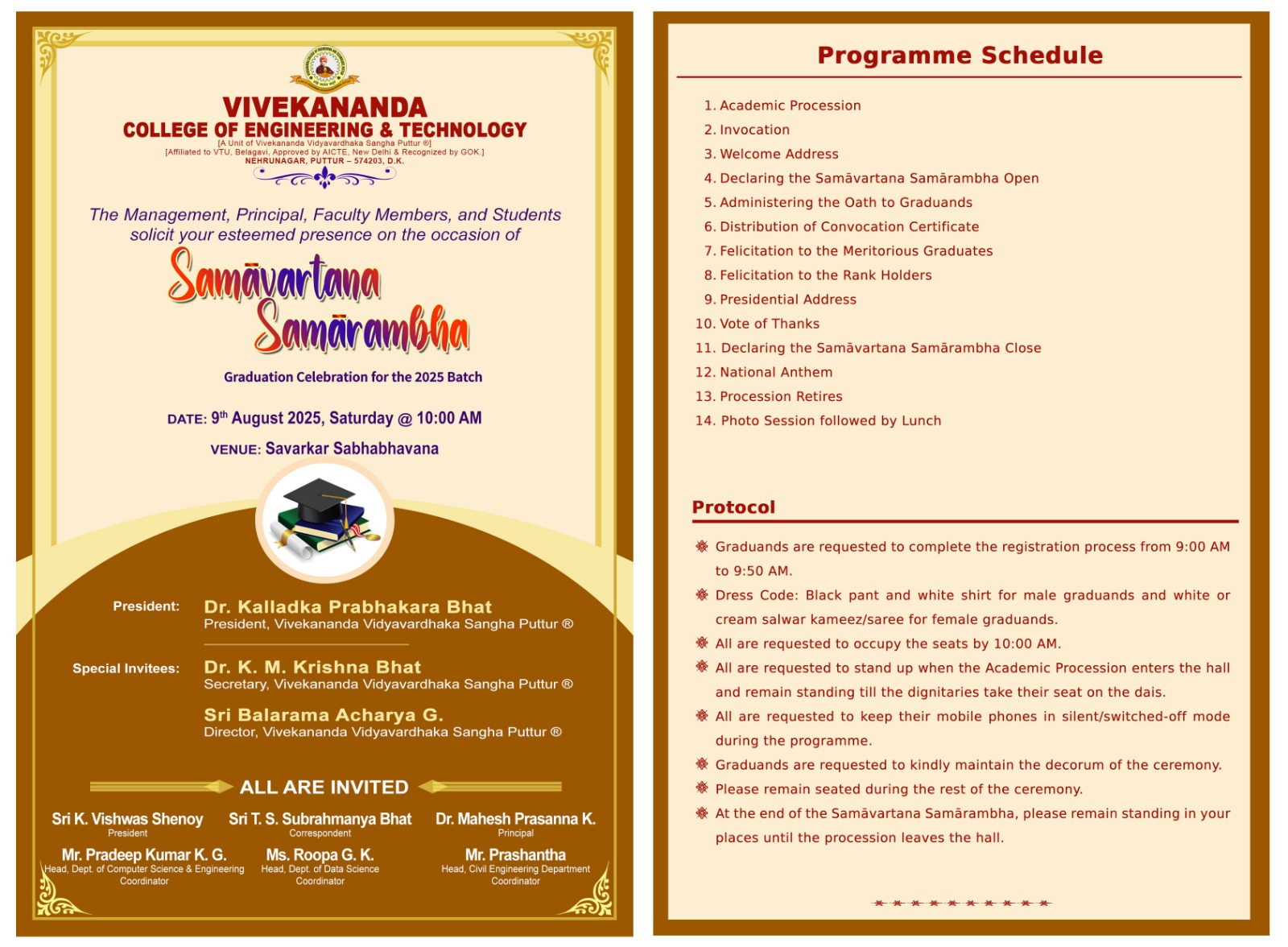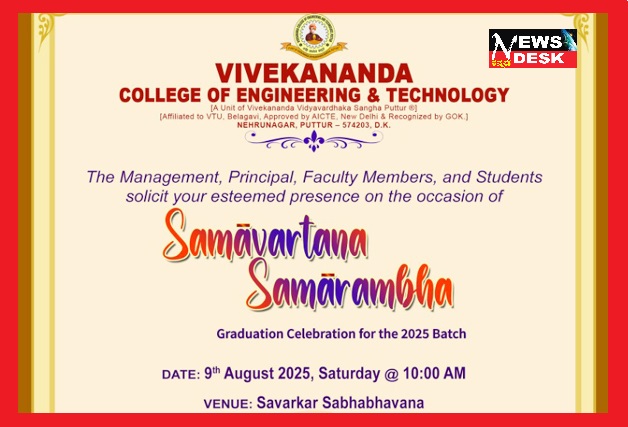 ಪುತ್ತೂರು ಆ.7 NEWS DESK : ಪುತ್ತೂರಿನ ವಿವೇಕಾನಂದ ಕಾಲೇಜ್ ಆಫ್ ಎಂಜಿನಿಯರಿಂಗ್ ಎಂಡ್ ಟೆಕ್ನಾಲಜಿಯಲ್ಲಿ ಪದವಿ ಪ್ರದಾನ ಕಾರ್ಯಕ್ರಮ ಸಮಾವರ್ತನ ಸಮಾರಂಭವು ಆ.9 ರಂದು ಕಾಲೇಜಿನ ಸಾವರ್ಕರ್ ಸಭಾಭವನದಲ್ಲಿ ನಡೆಯಲಿದೆ. 2024-25ನೇ ಸಾಲಿನಲ್ಲಿ ವಿಶ್ವೇಶ್ವರಯ್ಯ ತಾಂತ್ರಿಕ ವಿಶ್ವವಿದ್ಯಾನಿಲಯವು ನಡೆಸಿದ ಇಂಜಿನಿಯರಿಂಗ್ ವಿಭಾಗಗಳ ಅಂತಿಮ ವರ್ಷದ ಪರೀಕ್ಷೆಯಲ್ಲಿ ತೇರ್ಗಡೆ ಹೊಂದಿ ಪದವೀದರರಾದ ಅರ್ಹ ವಿದ್ಯಾರ್ಥಿಗಳಿಗೆ ಪದವಿ ಪ್ರದಾನ ಮಾಡಲಾಗುತ್ತದೆ. ಪ್ರಸಕ್ತ ಶೈಕ್ಷಣಿಕ ವರ್ಷದಲ್ಲಿ ರ್ಯಾಂಕ್ ಗಳಿಸಿಕೊಂಡಿರುವ ಸುಚಿತಾ, ಪ್ರಜ್ಞಾಶಂಕರಿ, ಸಿಂಚನಲಕ್ಷ್ಮಿ, ಶ್ರೀಲಕ್ಷ್ಮಿ.ವಿ, ರÀವಿನಾರಾಯಣ.ಕೆ.ಎಸ್, ರಾಹುಲ್.ಕೆ, ಲಿಖಿತ.ಕೆ ಇವರನ್ನು ಈ ಸಂದರ್ಭದಲ್ಲಿ ಸನ್ಮಾನಿಸಲಾಗುವುದು. ಪ್ರತಿ ವಿಭಾಗದಲ್ಲಿ ಶೈಕ್ಷಣಿಕವಾಗಿ ಉನ್ನತ ಸಾಧನೆಯನ್ನು ಮಾಡಿದ ಪ್ರತಿಭಾವಂತ ವಿದ್ಯಾರ್ಥಿಗಳನ್ನು ಗೌರವಿಸುವ ಕಾರ್ಯಕ್ರಮವೂ ನಡೆಯುತ್ತದೆ. ಅಂದು ಬೆಳಿಗ್ಗೆ 10 ಗಂಟೆಗೆ ಈ ಸಮಾರಂಭ ನಡೆಯಲಿದ್ದು, ವಿವೇಕಾನಂದ ವಿದ್ಯಾವರ್ಧಕ ಸಂಘದ ಅಧ್ಯಕ್ಷ ಡಾ.ಕಲ್ಲಡ್ಕ ಪ್ರಭಾಕರ್ ಭಟ್ ಅಧ್ಯಕ್ಷತೆ ವಹಿಸಲಿದ್ದಾರೆ. ಕಾರ್ಯದರ್ಶಿ ಡಾ.ಕೆ.ಎಂ.ಕೃಷ್ಣ ಭಟ್ ಹಾಗೂ ನಿರ್ದೇಶಕ ಬಲರಾಮ ಆಚಾರ್ಯ.ಜಿ ವಿಶೇಷ ಆಹ್ವಾನಿತರಾಗಿ ಆಗಮಿಸುತ್ತಾರೆ. ಇಂಜಿನಿಯರಿಂಗ್ ಕಾಲೇಜು ಆಡಳಿತ ಮಂಡಳಿಯ ಅಧ್ಯಕ್ಷರು, ಸಂಚಾಲಕರು, ನಿರ್ದೇಶಕರು, ಪ್ರಾಂಶುಪಾಲರು ಮತ್ತು ವಿಭಾಗ ಮುಖ್ಯಸ್ಥರು ಸಮಾರಂಭದಲ್ಲಿ ಉಪಸ್ಥಿತರಿರುತ್ತಾರೆ ಎಂದು ಪ್ರಾಂಶುಪಾಲ ಡಾ.ಮಹೇಶ್ಪ್ರಸನ್ನ.ಕೆ. ತಿಳಿಸಿದ್ದಾರೆ.