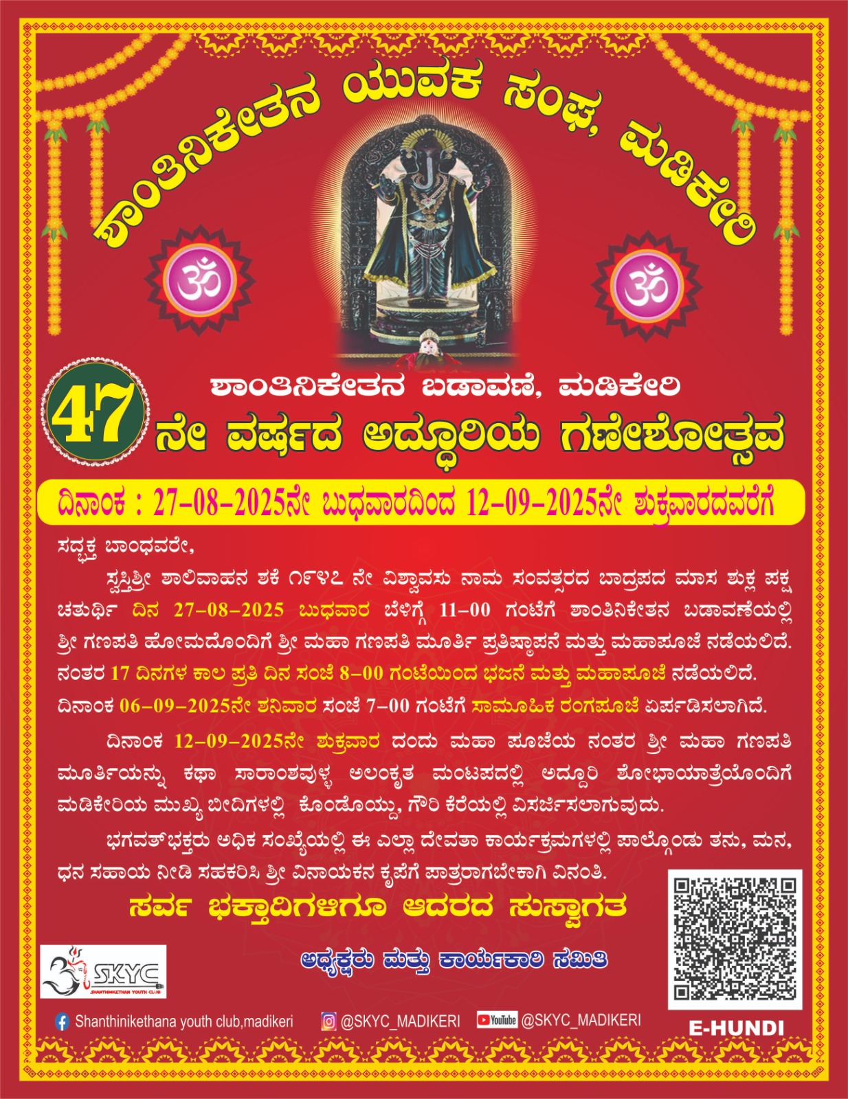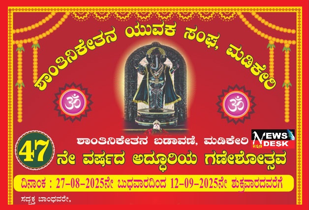 ಮಡಿಕೇರಿ ಆ.25 NEWS DESK : ಶಾಂತಿನಿಕೇತನ ಯುವಕ ಸಂಘದ ವತಿಯಿಂದ ಆ.27 ರಿಂದ ಸೆ.12ರ ವರೆಗೆ 47ನೇ ವರ್ಷದ ಅದ್ಧೂರಿ ಗಣೇಶೋತ್ಸವ ನಡೆಯಲಿದೆ. ಆ.27 ರಂದು ಬೆಳಿಗ್ಗೆ 11 ಗಂಟೆಗೆ ಶಾಂತಿನಿಕೇತನ ಬಡಾವಣೆಯಲ್ಲಿ ಶ್ರೀ ಗಣಪತಿ ಹೋಮದೊಂದಿಗೆ ಶ್ರೀ ಮಹಾ ಗಣಪತಿ ಮೂರ್ತಿ ಪ್ರತಿಷ್ಠಾಪನೆ ಮತ್ತು ಮಹಾಪೂಜೆ ನಡೆಯಲಿದೆ. ನಂತರ 17 ದಿನಗಳ ಕಾಲ ಪ್ರತಿ ದಿನ ರಾತ್ರಿ 8 ಗಂಟೆಯಿಂದ ಭಜನೆ ಮತ್ತು ಮಹಾಪೂಜೆ ಜರುಗಲಿದೆ. ಸೆ.6 ರಂದು ಸಂಜೆ 7 ಗಂಟೆಗೆ ಸಾಮೂಹಿಕ ರಂಗ ಪೂಜೆ ನಡೆಯಲಿದ್ದು, ಸೆ.12 ರಂದು ಮಹಾಪೂಜೆ ನಂತರ ಶ್ರೀ ಮಹಾ ಗಣಪತಿ ಮೂರ್ತಿಯನ್ನು ಕಥಾ ಸಾರಾಂಶವುಳ್ಳ ಅಲಂಕೃತ ಮಂಟಪದಲ್ಲಿ ಅದ್ದೂರಿ ಶೋಭಾಯಾತ್ರೆಯೊಂದಿಗೆ ಮಡಿಕೇರಿಯ ಮುಖ್ಯ ಬೀದಿಗಳಲ್ಲಿ ಕೊಂಡೊಯ್ದು, ಗೌರಿ ಕೆರೆಯಲ್ಲಿ ವಿಸರ್ಜಿಸಲಾಗುವುದು. ಭಕ್ತಾಧಿಗಳು ಹೆಚ್ಚಿನ ಸಂಖ್ಯೆಯಲ್ಲಿ ಪಾಲ್ಗೊಳ್ಳುವಂತೆ ಶಾಂತಿನಿಕೇತನ ಯುವ ಸಂಘ ಮನವಿ ಮಾಡಿದೆ.