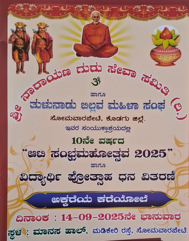 *ಸೋಮವಾರಪೇಟೆ : ಸೆ.14 ರಂದು ಆಟಿ ಸಂಭ್ರಮೋತ್ಸವ ಹಾಗೂ ವಿದ್ಯಾರ್ಥಿಗಳಿಗೆ ಪ್ರೋತ್ಸಾಹ ಧನ ವಿತರಣೆ*