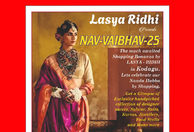 *ಸೋಮವಾರಪೇಟೆಯಲ್ಲಿ ನವ್-ವೈಭವ್* ಸೋಮವಾರ ಸೆಪ್ಟೆಂಬರ್ 22 ರಂದು ಸೋಮವಾರಪೇಟೆಯ ಸಾಕ್ಷಿ ಕನ್ವೆಷನ್ ಹಾಲ್ ನಲ್ಲಿ ಲಾಸ್ಯ -ರಿಧಿ ಆಯೋಜಿಸಿರುವ ಪ್ರದರ್ಶನ ಹಾಗೂ ಮಾರಾಟ. ನಾಡಹಬ್ಬವನ್ನು ಸಂಭ್ರಮದಿಂದ ಬರಮಾಡಿಕೊಳ್ಳಲು ಸುವರ್ಣಾವಕಾಶ. ನಾಡಿನ ಸುಪ್ರಸಿದ್ದ ಸಂಸ್ಥೆಗಳಿಂದ ವಿನ್ಯಾಸಗೊಂಡ ರೆಡಿಮೇಡ್ ಉಡುಪುಗಳು – ಮಹಿಳೆಯರ ಡಿಸೈನರ್ ಸೀರೆಗಳು ಹಾಗೂ ಉಡುಗೆಗಳು – ಗೃಹಬಳಕೆ ಸಾಮಗ್ರಿಗಳು – ಆರ್ಗಾನಿಕ್ ಉತ್ಪನ್ನಗಳು – ಆಯ್ದ ವಿನೂತನ ಶೈಲಿಯ ಆಭರಣಗಳು – ಪ್ರದರ್ಶನ ಹಾಗೂ ಮಾರಾಟಕ್ಕೆ ಲಭ್ಯ ಇರುತ್ತವೆ. ಬಳಸಿದ ಜರಿರೇಶ್ಮೆ ಸೀರೆಗಳನ್ನು ಜರಿಯ ಮೌಲ್ಯ ನಿರ್ಧರಿಸಿ ಖರೀದಿಸಲಾಗುತ್ತದೆ. ಗ್ರಾಹಕರಿಗೆ ಆಹ್ಲಾದ ನೀಡಲು ಕಾಫಿ ಶಾಪ್ ವಿವಿಧ ಬಗೆಯ ವಿಶೇಷ ಕೇಕ್ ಮುಂತಾದ ಬೇಕಿಂಗ್ ಉತ್ಪನ್ನಗಳು ಕೊಡಗಿನ ಸಾಂಪ್ರದಾಯಿಕ ಶೈಲಿಯಲ್ಲಿ ಸಿದ್ಧಪಡಿಸಿದ ವೆಜ್ ಹಾಗೂ ನಾನ್ ವೆಜ್ ಖಾದ್ಯಗಳು. ಇನ್ ಡೋರ್ ಗಿಡಗಳನ್ನು ಬೆಳೆಸುವ ಮಣ್ಣು ಹಾಗೂ ಸೆರಾಮಿಕ್ ಪಾಟ್ ಗಳು. ಮರ ಹಾಗೂ ಲೋಹದಿಂದ ತಯಾರಿಸಿದ ಅಲಂಕಾರಿಕ ಕರಕುಶಲ ವಸ್ತುಗಳು. ಬನ್ನಿ… ದಸರಾ ನವರಾತ್ರಿಯ ಪವಿತ್ರ ನಾಡಹಬ್ಬಕ್ಕೆ ಮೆರಗು ನೀಡುವ ನವ್-ವೈಭವ್ ಪ್ರದರ್ಶನ ಹಾಗೂ ಮಾರಾಟಕ್ಕೆ ನಿಮ್ಮ ಆತ್ಮೀಯರನ್ನೂ ಕರೆತನ್ನಿ. ನೆನಪಿಡಿ ಸೆಪ್ಟೆಂಬರ್ 22, ಸೋಮವಾರ, ಸಾಕ್ಷಿ ಕನ್ವೆಷನ್ ಹಾಲ್.. ಸೋಮವಾರಪೇಟೆಯಲ್ಲಿ, ನವ್ – ವೈಭವ್ . ತಮಗೆ ಆತ್ಮೀಯ ಆಮಂತ್ರಣ*