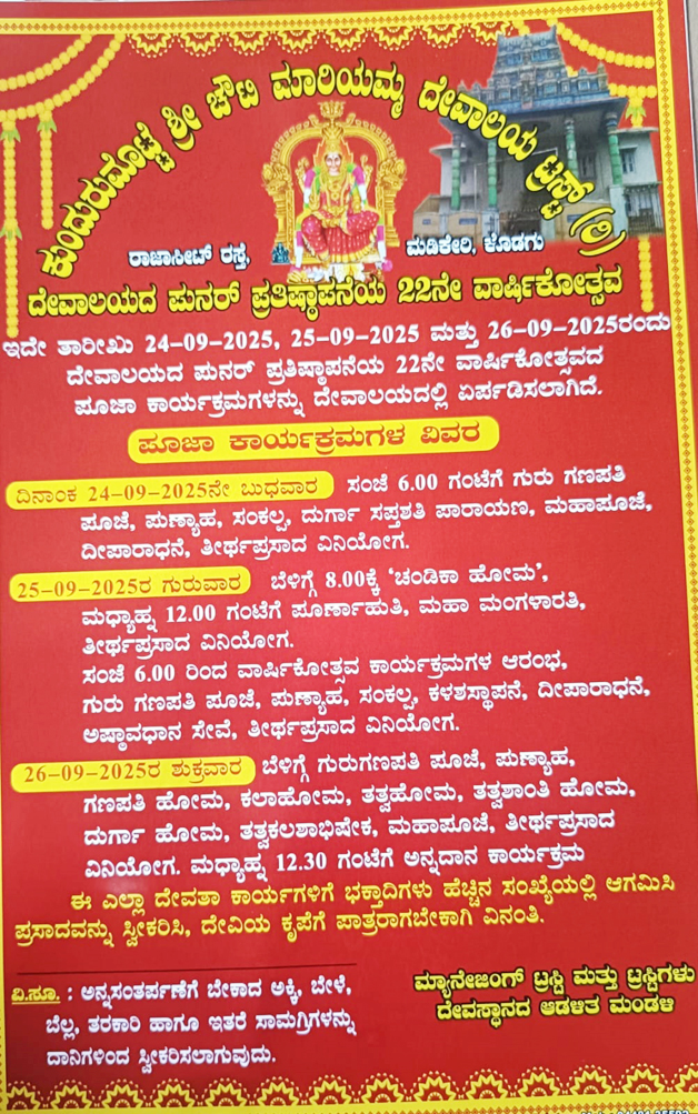 ಮಡಿಕೇರಿ ಸೆ.24 NEWS DESK : ನಗರದ ನಾಲ್ಕು ಶಕ್ತಿ ದೇವತೆಗಳಲ್ಲಿ ಒಂದಾದ ಕುಂದುರುಮೊಟ್ಟೆ ಶ್ರೀ ಚೌಟಿಮಾರಿಯಮ್ಮ ದೇವಾಲಯದ ಪುನರ್ ಪ್ರತಿಷ್ಠಾಪನೆಯ 22ನೇ ವಾರ್ಷಿಕೋತ್ಸವವು ಸೆ.24 (ಇಂದು) ರಿಂದ 26ರ ವರೆಗೆ ನಡೆಯಲಿದೆ. ಸೆ.24 (ಇಂದು) ರಂದು ಸಂಜೆ 6 ಗಂಟೆಗೆ ಗುರು ಗಣಪತಿ ಪೂಜೆ, ಪುಣ್ಯಾಹ, ಸಂಕಲ್ಪ, ದುರ್ಗಾ ಸಪ್ತಶತಿ ಪಾರಾಯಣ, ಮಹಾಪೂಜೆ, ದೀಪರಾಧನೆ ಹಾಗೂ ತೀರ್ಥಪ್ರಸಾದ ವಿನಿಯೋಗ ನಡೆಯಲಿದೆ. ಸೆ.25 ರಂದು ಬೆಳಿಗ್ಗೆ 8 ಗಂಟೆಗೆ ಚಂಡಿಕಾ ಹೋಮ, ಮಧ್ಯಾಹ್ನ 12 ಗಂಟೆಗೆ ಪೂರ್ಣಾಹುತಿ ಹಾಗೂ ಮಹಾ ಮಂಗಳಾರತಿ ಜರುಗಲಿದ್ದು, ನಂತರ ತೀರ್ಥಪ್ರಸಾದ ವಿನಿಯೋಗ ನೆರವೇರಲಿದೆ. ಸಂಜೆ 6 ಗಂಟೆಯಿಂದ ವಾರ್ಷಿಕೋತ್ಸವ ಕಾರ್ಯಕ್ರಮಗಳು ಆರಂಭವಾಗಲಿದ್ದು, ಗುರು ಗಣಪತಿ ಪೂಜೆ, ಪುಣ್ಯಾಹ, ಸಂಕಲ್ಪ, ಕಳಶಸ್ಥಾಪನೆ, ದೀಪಾರಾಧನೆ, ಅಷ್ಠಾವಧಾನ ಸೇವೆ ನಂತರ ತೀರ್ಥಪ್ರಸಾದ ವಿನಿಯೋಗವಾಗಲಿದೆ. ಸೆ.26 ರಂದು ಬೆಳಿಗ್ಗೆ ಗುರುಗಣಪತಿ ಪೂಜೆ, ಪುಣ್ಯಾಹ, ಗಣಪತಿ ಹೋಮ, ಕಲಾಹೋಮ, ತತ್ವಹೋಮ, ತತ್ವಶಾಂತಿ ಹೋಮ, ದುರ್ಗಾ ಹೋಮ, ತತ್ವಕಲಶಾಭಿಷೇಕ, ಮಹಾಪೂಜೆ, ತೀರ್ಥಪ್ರಸಾದ ವಿನಿಯೋಗ ನಡೆಯಲಿದೆ. ಮಧ್ಯಾಹ್ನ 12.30 ಗಂಟೆಗೆ ಅನ್ನದಾನ ನೆರವೇರಲಿದ್ದು, ಭಕ್ತಾಧಿಗಳು ಹೆಚ್ಚಿನ ಸಂಖ್ಯೆಯಲ್ಲಿ ಆಗಮಿಸುವಂತೆ ದೇವಾಲಯದ ಮ್ಯಾನೇಜಿಂಗ್ ಟ್ರಸ್ಟಿ ಮತ್ತು ಆಡಳಿತ ಮಂಡಳಿ ಕೋರಿದೆ.