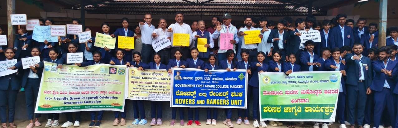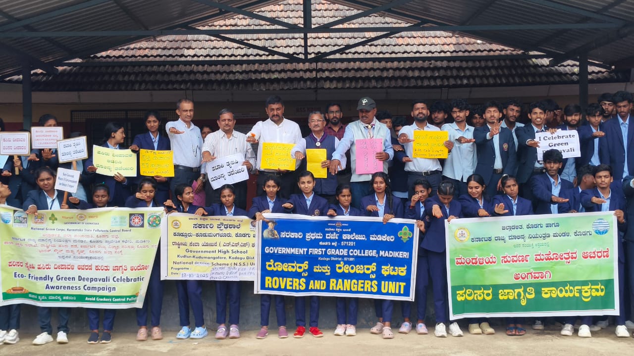 ಮಡಿಕೇರಿ, ಅ.18 NEWS DESK : ಕೊಡಗು ಜಿಲ್ಲಾಡಳಿತ, ಜಿಲ್ಲಾ ಪಂಚಾಯತ್, ಕರ್ನಾಟಕ ರಾಜ್ಯ ಮಾಲಿನ್ಯ ನಿಯಂತ್ರಣ ಮಂಡಳಿಯ ಕೊಡಗು ಪ್ರಾದೇಶಿಕ ಕಛೇರಿ, ಶಿಕ್ಷಣ ಇಲಾಖೆ, ರಾಷ್ಟ್ರೀಯ ಹಸಿರು ಪಡೆಯ ಇಕೋ ಕ್ಲಬ್ ಘಟಕ, ಭಾರತ್ ಸ್ಕೌಟ್ಸ್ ಮತ್ತು ಗೈಡ್ಸ್ ನ ಕೊಡಗು ಜಿಲ್ಲಾ ಸಂಸ್ಥೆ, ಕರ್ನಾಟಕ ರಾಜ್ಯ ವಿಜ್ಞಾನ ಪರಿಷತ್ತಿನ ಕೊಡಗು ಜಿಲ್ಲಾ ಸಮಿತಿ ವತಿಯಿಂದ ಮಡಿಕೇರಿ ನಗರದ ಸರ್ಕಾರಿ ಪ್ರಥಮ ದರ್ಜೆ ಕಾಲೇಜಿನಲ್ಲಿ ರೋವರ್ಸ್ ಮತ್ತು ರೇಂಜರ್ಸ್ ಘಟಕಗಳು, ಎನ್.ಎಸ್.ಎಸ್.ಘಟಕದ ಸಹಯೋಗದೊಂದಿಗೆ “ನಮ್ಮ ನಡೆ ಹಸಿರೆಡೆಗೆ”: “ಗೋ ಗ್ರೀನ್ ಅಭಿಯಾನ”: 2025 ದಡಿ ಸ್ವಚ್ಛ ದೀಪಾವಳಿ, ಸ್ವಸ್ಥ ದೀಪಾವಳಿ-2025*ಅಂಗವಾಗಿ *ಪರಿಸರ ಸ್ನೇಹಿ ಹಸಿರು ದೀಪಾವಳಿ ಆಚರಣೆ ಕುರಿತು ಜಿಲ್ಲಾಮಟ್ಟದ ಜಾಗೃತಿ ಅಭಿಯಾನ ಏರ್ಪಡಿಸಲಾಗಿತ್ತು. ಹಣತೆ(ಮಣ್ಣಿನ ದೀಪ) ಬೆಳಗಿಸಿ ಹಸಿರು ದೀಪಾವಳಿ ಆಚರಣೆ ಕಾರ್ಯಕ್ರಮಕ್ಕೆ ಚಾಲನೆ ನೀಡಿದ ಭಾರತ್ ಸ್ಕೌಟ್ಸ್ ಮತ್ತು ಗೈಡ್ಸ್ ಕೊಡಗು ಜಿಲ್ಲಾ ಸಂಸ್ಥೆಯ ಪ್ರಧಾನ ಆಯುಕ್ತ ಕೆ.ಟಿ.ಬೇಬಿಮ್ಯಾಥ್ಯೂ ಮಾತನಾಡಿ, ಬೆಳಕಿನ ಹಬ್ಬ ದೀಪಾವಳಿ ಸಂದರ್ಭದಲ್ಲಿ ‘ಪ್ರತಿಯೊಬ್ಬರೂ