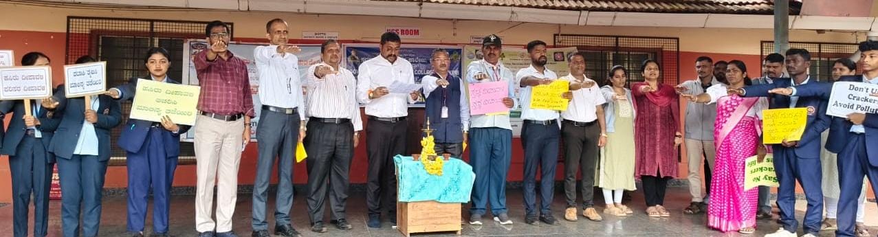ಹಸಿರು ದೀಪಾವಳಿ ಆಚರಿಸಲಾಗುವುದು ಎಂದು ಪ್ರತಿಜ್ಞೆ ಸ್ವೀಕರಿಸಿದರು. ಕಾಲೇಜಿನ ಎನ್.ಎಸ್.ಎಸ್.ಅಧಿಕಾರಿ ಟಿ.ಎಂ. ಸುಧಾಕರ್, ಸ್ಕೌಟ್ಸ್ ರೋವರ್ಸ್ ನ ಲೀಡರ್ ನವೀನ್ ಕುಮಾರ್, ಮಂಡಳಿಯ ಯೋಜನಾ ಸಹಾಯಕ ಆಸ್ಟಿನ್, ಉಪನ್ಯಾಸಕರು, ಬೋಧಕೇತರ ಸಿಬ್ಬಂದಿ, ರೇಂಜರ್ಸ್ ಮತ್ತು ರೋವರ್ಸ್ ಸ್ವಯಂ ಸೇವಕರು ಹಾಗೂ ವಿದ್ಯಾರ್ಥಿಗಳು ಇದ್ದರು. :: ವಿದ್ಯಾರ್ಥಿಗಳಿಂದ ಪ್ರತಿಜ್ಞೆ ಸ್ವೀಕಾರ:: ಬೆಳಕಿನ ಹಬ್ಬ ದೀಪಾವಳಿ ಹಬ್ಬದ ಸಂದರ್ಭದಲ್ಲಿ ಮಾಲಿನ್ಯಕಾರಿ ಪಟಾಕಿ ಸಿಡಿಸುವುದನ್ನು ಬಿಟ್ಟು ಪರಿಸರ ಸಂರಕ್ಷಣೆಯ ದೃಷ್ಟಿಯಿಂದ ಪರಿಸರ ಸ್ನೇಹಿ ಹಸಿರು ದೀಪಾವಳಿ ಆಚರಿಸುವುದಾಗಿ ಕಾಲೇಜು ವಿದ್ಯಾರ್ಥಿಗಳು ಪ್ರತಿಜ್ಞೆ ಸ್ವೀಕರಿಸಿದರು. :: ವಿದ್ಯಾರ್ಥಿಗಳಿಂದ ಪ್ರತಿಜ್ಞಾ ವಿಧಿ ಸ್ವೀಕಾರ:: ವಿದ್ಯಾರ್ಥಿಗಳು ಈ ಆಂದೋಲನದಲ್ಲಿ ವಿದ್ಯಾರ್ಥಿಗಳು ‘ಹಣತೆ ಬೆಳಗಿಸೋಣ, ಪಟಾಕಿ ತ್ಯಜಿಸೋಣ’, ಪಟಾಕಿ ತ್ಯಜಿಸೋಣ -ಪರಿಸರ ಉಳಿಸೋಣ ಬನ್ನಿ’, ಮಾಲಿನ್ಯಕಾರಿ ಪಟಾಕಿ ತ್ಯಜಿಸಿ, ಹಸಿರು ದೀಪಾವಳಿ ಆಚರಿಸಿ,