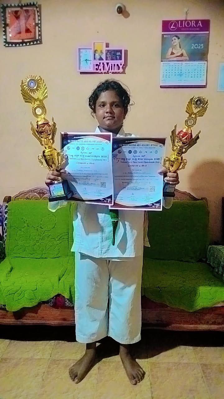 ಮಡಿಕೇರಿ ಅ.28 NEWS DESK : ಮೈಸೂರಿನಲ್ಲಿ ವಿ.ಯನ್ ಯೋಧ ಮಾರ್ಷಲ್ ಆರ್ಟ್ಸ್ ಅಕಾಡೆಮಿ ನಡೆಸಿದ ಐದನೇ ರಾಷ್ಟ್ರೀಯ ಮುಕ್ತ ಕರಾಟೆ ಪಂದ್ಯಾವಳಿಯಲ್ಲಿ ವಿರಾಜಪೇಟೆ ಸಂತ ಅನ್ನಮ್ಮ ಶಾಲೆಯ 6ನೇ ತರಗತಿ ವಿದ್ಯಾರ್ಥಿನಿ ಅನನ್ಯ ಕೊಕ್ಕೆರ ಕಾವೇರಮ್ಮ ಚಾಂಪಿಯನ್ ಆಗಿದ್ದಾಳೆ. 11 ರ ವಯೋಮಿತಿಯವರ ವಿಭಾಗದ ಕಥಾದಲ್ಲಿ ಪ್ರಥಮ ಸ್ಥಾನ ಮತ್ತು ಕುಮಿತೆಯಲ್ಲಿ ತೃತೀಯ ಸ್ಥಾನ ಪಡೆದುಕೊಂಡಿದ್ದಾಳೆ. ಅನನ್ಯ ಕಾವೇರಮ್ಮ ಕರಾಟೆ ಶಿಕ್ಷಕರಾದ ವಿರಾಜಪೇಟೆಯ ಸೆನ್ಸಾಯಿ ಎಂ.ಬಿ.ಚಂದ್ರನ್ ಅವರಲ್ಲಿ ತರಬೇರಿ ಪಡೆಯುತ್ತಿದ್ದಾಳೆ. ಇವಳು ಕೊಕ್ಕೆರ ರಾಯಿ ಮತ್ತು ರತಿ (ತಾಮನೆ-ಚಂಗಚಂಡ) ದಂಪತಿಯ ಪುತ್ರಿ.