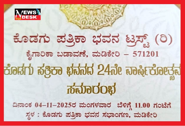 ಮಡಿಕೇರಿ ನ.1 NEWS DESK : ಕೊಡಗು ಪತ್ರಿಕಾ ಭವನ ಟ್ರಸ್ಟಿನ 24ನೇ ವಾರ್ಷಿಕೋತ್ಸವ ನ.4 ರಂದು ಬೆಳಿಗ್ಗೆ 11 ಗಂಟೆಗೆ ನಗರದ ಕೊಡಗು ಪತ್ರಿಕಾ ಭವನದ ಸಭಾಂಗಣದಲ್ಲಿ ನಡೆಯಲಿದೆ. ಕಾರ್ಯಕ್ರಮದ ಅಧ್ಯಕ್ಷತೆಯನ್ನು ಪತ್ರಿಕಾ ಭವನ ಟ್ರಸ್ಟಿನ ಮ್ಯಾನೇಜಿಂಗ್ ಟ್ರಸ್ಟಿಗಳಾದ ಎಂ.ಪಿ.ಕೇಶವ ಕಾಮತ್ರವರು ವಹಿಸಲಿದ್ದು, ಚಿಕ್ಕಅಳುವಾರದ ಕೊಡಗು ವಿಶ್ವವಿದ್ಯಾಲಯದ ಉಪಕುಲಪತಿಗಳಾದ ಡಾ.ಅಶೋಕ್ ಸಂಗಪ್ಪ ಆಲೂರ ಅವರು ಕಾರ್ಯಕ್ರಮ ಉದ್ಘಾಟಿಸಲಿದ್ದಾರೆ. ಮುಖ್ಯ ಅತಿಥಿಗಳಾಗಿ ವಿಜಯ ಕರ್ನಾಟಕ ಪತ್ರಿಕೆಯ ಮೈಸೂರು ವಿಭಾಗದ ಸ್ಥಾನಿಕ ಸಂಪಾದಕರಾದ ಐತಿಚಂಡ ರಮೇಶ್ ಉತ್ತಪ್ಪ ಪಾಲ್ಗೊಂಡು ಮುಖ್ಯ ಭಾಷಣ ಮಾಡಲಿದ್ದಾರೆ. ಮುಖ್ಯ ಅತಿಥಿಗಳಾದ ಕೊಡಗು ಪತ್ರಕರ್ತರ ಸಂಘದ ಅಧ್ಯಕ್ಷರಾದ ಅನಿಲ್ ಹೆಚ್.ಟಿ. ಅವರು, ವಾರ್ಷಿಕೋತ್ಸವ ಹಿನ್ನೆಲೆ ಆಯೋಜಿತ ಒಳಾಂಗಣ ಕ್ರೀಡಾಕೂಟದಲ್ಲಿ ಪಾಲ್ಗೊಂಡು ವಿಜೇತರಾದ ಸ್ಪರ್ಧಿಗಳಿಗೆ ಬಹುಮಾನವನ್ನು ಮತ್ತು ಸ್ಪರ್ಧೆಯಲ್ಲಿ ಪಾಲ್ಗೊಂಡವರಿಗೆ ಕಿರುಕಾಣಿಕೆಯನ್ನು ವಿತರಿಸಲಿದ್ದಾರೆಂದು ಪತ್ರಿಕಾ ಭವನ ಟ್ರಸ್ಟಿನ ಪ್ರಧಾನ ಕಾರ್ಯದರ್ಶಿ ಎಸ್.ಜಿ ಉಮೇಶ್ ಪತ್ರಿಕಾ ಪ್ರಕಟಣೆಯಲ್ಲಿ ತಿಳಿಸಿದ್ದಾರೆ.