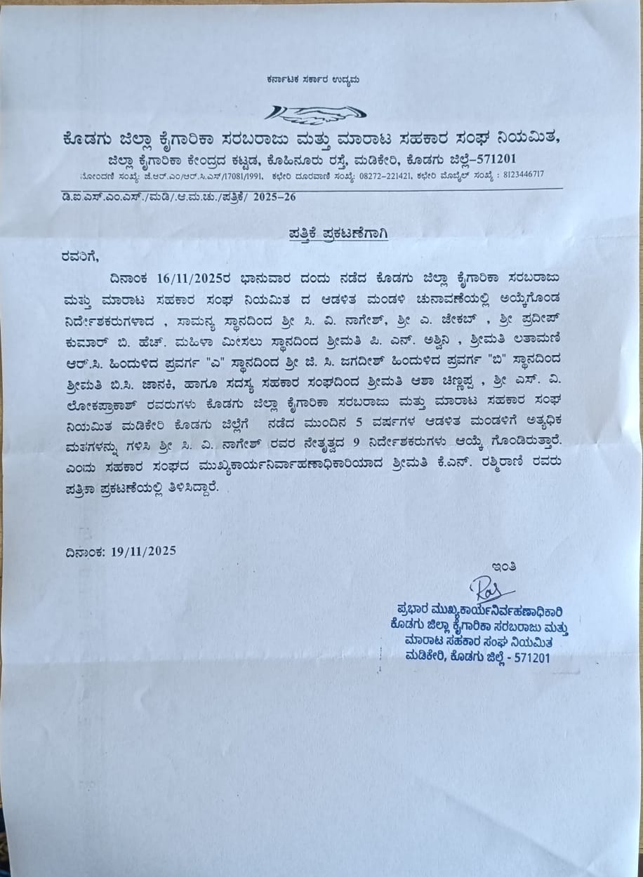 ಮಡಿಕೇರಿ ನ.19 NEWS DESK : ಕೊಡಗು ಜಿಲ್ಲಾ ಕೈಗಾರಿಕಾ ಸರಬರಾಜು ಮತ್ತು ಮಾರಾಟ ಸಹಕಾರ ಸಂಘಕ್ಕೆ ಮುಂದಿನ 5 ವರ್ಷಗಳ ಅವಧಿಯ ಆಡಳಿತ ಮಂಡಳಿಗೆ ಅತ್ಯಧಿಕ ಮತಗಳನ್ನು ಗಳಿಸಿ ಸಂಘದ ಮಾಜಿ ಅಧ್ಯಕ್ಷ ಸಿ.ವಿ.ನಾಗೇಶ್ ಅವರ ನೇತೃತ್ವದ 9 ನಿರ್ದೇಶಕರುಗಳು ಆಯ್ಕೆಯಾಗಿದ್ದಾರೆ.