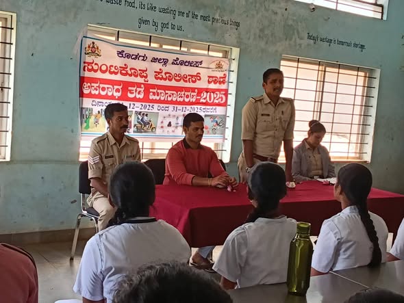 Facebook Twitter WhatsApp Email Telegram Copy Link ಮಡಿಕೇರಿ ಡಿ.20 NEWS DESK : ಅಪರಾಧ ತಡೆ ಮಾಸಾಚರಣೆ ಸಂಬಂಧವಾಗಿ ಸುಂಟಿಕೊಪ್ಪ ಠಾಣೆಯ ಅಧಿಕಾರಿ ಮತ್ತು ಸಿಬ್ಬಂದಿಗಳು ಗರಗಂದೂರಿನಲ್ಲಿರುವ ಮೊರಾರ್ಜಿ ದೇಸಾಯಿ ಶಾಲೆಗೆ ಭೇಟಿ ನೀಡಿ ವಿದ್ಯಾರ್ಥಿಗಳಿಗೆ ಕಾನೂನು ಅರಿವು ಮೂಡಿಸಿದರು.
