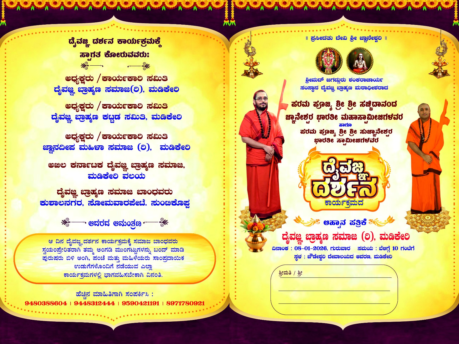 ಮಡಿಕೇರಿ ಜ.7 NEWS DESK : ಜಗದ್ಗುರು ಶಂಕರಾಚಾರ್ಯ ಸಂಸ್ಥಾನ ದೈವಜ್ಞ ಬ್ರಾಹ್ಮಣ ಮಠಾಧೀಶರಾದ ಶ್ರೀಶ್ರೀ ಸಚ್ಚಿದಾನಂದ ಜ್ಞಾನೇಶ್ವರ ಭಾರತೀ ಮಹಾಸ್ವಾಮೀಜಿ ಹಾಗೂ ಶ್ರೀಶ್ರೀ ಸುಜ್ಞಾನೇಶ್ವರ ಭಾರತೀ ಸ್ವಾಮೀಜಿಗಳ ದೈವಜ್ಞ ದರ್ಶನ ಕಾರ್ಯಕ್ರಮ ದೈವಜ್ಞ ಬ್ರಾಹ್ಮಣ ಸಮಾಜದ ವತಿಯಿಂದ ಜ.8 ರಂದು ಮಡಿಕೇರಿಯಲ್ಲಿ ನಡೆಯಲಿದೆ. ಸಂಜೆ 4.30 ಗಂಟೆಗೆ ಶ್ರೀಶ್ರೀಗಳ ಪುರಪ್ರವೇಶವಾಗಲಿದೆ. ನಂತರ ಪೂರ್ಣ ಕುಂಭ ಮೆರವಣಿಗೆ ನಗರದ ಹಳೇ ಖಾಸಗಿ ಬಸ್ ನಿಲ್ದಾಣದಿಂದ ಚೌಡೇಶ್ವರಿ ದೇವಾಲಯದವರೆಗೆ ಸಾಗಲಿದೆ. ನಂತರ ಶ್ರೀಗಳಿಗೆ ಪಾದುಕಾ ಪೂಜೆ, ಶ್ರೀಗಳಿಂದ ಆಶೀರ್ವಚನ, ಫುಲಪುಷ್ಪ ಸಮರ್ಪಣೆ, ಫಲ ಮಂತ್ರಾಕ್ಷತೆ ನೆರವೇರಲಿದೆ ಎಂದು ದೈವಜ್ಞ ಬ್ರಾಹ್ಮಣ ಸಮಾಜದ ಪ್ರಮುಖರು ಮಾಹಿತಿ ನೀಡಿದ್ದಾರೆ. ಸ್ವಾಮೀಜಿಗಳ ಭವ್ಯ ಸ್ವಾಗತಕ್ಕಾಗಿ ನಗರದ ಮಹದೇವಪೇಟೆ ಹಾಗೂ ಶ್ರೀಚೌಡೇಶ್ವರಿ ದೇವಾಲಯವನ್ನು ತಳಿರು ತೋರಣ, ವಿದ್ಯುತ್ ದೀಪಗಳಿಂದ ಆಕರ್ಷಣೀಯವಾಗಿ ಅಲಂಕಾರಗೊಳಿಸಲಾಗಿದೆ. ದೈವಜ್ಞ ಬ್ರಾಹ್ಮಣ ಸಮಾಜದ ಬಂಧುಗಳು ಹಾಗೂ ಭಕ್ತರು ಹೆಚ್ಚಿನ ಸಂಖ್ಯೆಯಲ್ಲಿ ಪಾಲ್ಗೊಳ್ಳುವಂತೆ ಮನವಿ ಮಾಡಿದ್ದಾರೆ.