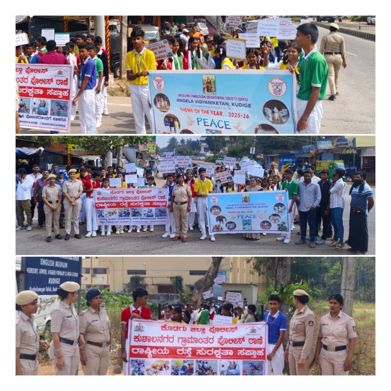ಮಡಿಕೇರಿ ಜ.7 NEWS DESK : ಕುಶಾಲನಗರ ಗ್ರಾಮಾಂತರ ಪೊಲೀಸ್ ಠಾಣೆ ವತಿಯಿಂದ ಕೂಡಿಗೆಯಲ್ಲಿ ರಸ್ತೆ ಸುರಕ್ಷತಾ ಸಪ್ತಾಹದ ಅಂಗವಾಗಿ ಜಾಥಾ ಮತ್ತು ಜಾಗೃತಿ ಕಾರ್ಯ ನಡೆಯಿತು. ಈ ಸಂದರ್ಭ ಠಾಣೆಯ ಅಧಿಕಾರಿಗಳು ಅಂಜಲ ವಿದ್ಯಾನಿಕೇತನ ಶಾಲೆಯ ವಿದ್ಯಾರ್ಥಿಗಳು ಹಾಗೂ ಸಾರ್ವಜನಿಕರೊಂದಿಗೆ ಕೂಡಿಗೆ ಸರ್ಕಲ್ ನಲ್ಲಿ ಸಭೆ ನಡೆಸಿ ರಸ್ತೆ ಸುರಕ್ಷತೆ, ಸಂಚಾರಿ ನಿಯಮಗಳ ಪಾಲಿಸುವ ಕುರಿತು, ರಸ್ತೆ ಅಪಘಾತದ ಸಂದರ್ಭ ನಾಗರಿಕ ಜವಾಬ್ದಾರಿ ಮುಂತಾದ ವಿಷಯಗಳ ಕುರಿತು ಜಾಗೃತಿ ಮೂಡಿಸಿದರು.
