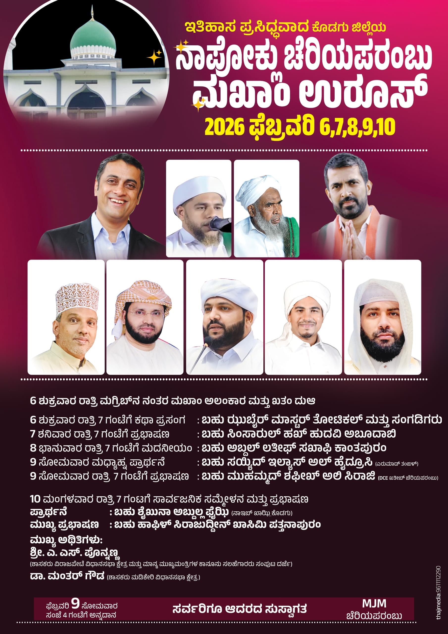 ನಾಪೋಕ್ಲು ಜ.27 NEWS DESK : ಚೆರಿಯಪರಂಬು ದರ್ಗಾದ ವಾರ್ಷಿಕ ಮಖಾಂ ಉರೂಸ್ ಸಮಾರಂಭದ ಪೋಸ್ಟರ್ ಅನ್ನು ಬಿಡುಗಡೆಗೊಳಸಲಾಯಿತು. ಪ್ರತಿ ವರ್ಷ ಜರುಗುವ ಉರೂಸ್ ಈ ವರ್ಷ ಫೆ.6 ರಿಂದ 10 ರವರೆಗೆ ವಿವಿಧ ಧಾರ್ಮಿಕ ಕಾರ್ಯಕ್ರಮಗಳೊಂದಿಗೆ ನಡೆಯಲಿದೆ. ಇದರ ಪೋಸ್ಟರ್ ಅನ್ನು ಜುಮಾ ನಮಾಜಿನ ಬಳಿಕ ಜುಮಾ ಮಸೀದಿಯ ಆವರಣದಲ್ಲಿ ಆಯೋಜಿಸಲಾದ ಸರಳ ಸಮಾರಂಭದಲ್ಲಿ ಮಸೀದಿಯ ಸಹಾಯಕ ಖತೀಬರಾದ ರಫೀಕ್ ಸಖಾಫಿ ಅವರು ಬಿಡುಗಡೆಗೊಳಿಸಿ ಶುಭ ಹಾರೈಸಿದರು. ಚೆರಿಯಪರಂಬು ಜಮಾಯತಿನ ಹಾಲಿ ಹಾಗೂ ಮಾಜಿ ಅಧ್ಯಕ್ಷರು ಪದಾಧಿಕಾರಿಗಳು, ಸದಸ್ಯರು ಹಾಗೂ ಮತ ಬಾಂಧವರು ಹಾಜರಿದ್ದರು.