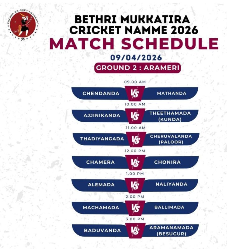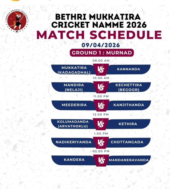 ಮಡಿಕೇರಿ ಏ.8 NEWS DESK : ಕೊಡವ ಕುಟುಂಬಗಳ ನಡುವೆ ಮೂರ್ನಾಡಿನಲ್ಲಿ ನಡೆಯುತ್ತಿರುವ 24ನೇ ವರ್ಷದ ‘ಬೇತ್ರಿ ಮುಕ್ಕಾಟಿರ ಕಪ್ ಕ್ರಿಕೆಟ್ ನಮ್ಮೆ’ ಯಲ್ಲಿ ಏ.9ರಂದು ನಡೆಯುವ ಪಂದ್ಯಗಳು. *ಮೈದಾನ 1* ಬೆಳಿಗ್ಗೆ 9 ಗಂಟೆಗೆ ಮುಕ್ಕಾಟಿರ (ಕಡಗದಾಳು) ಮತ್ತು ಕನ್ನಂಡ, 10ಕ್ಕೆ ಮಂಡೀರ (ನೆಲಜಿ) ಮತ್ತು ಕೇಚೆಟ್ಟಿರ (ಬೇಗೂರು), 11ಕ್ಕೆ ಮೀದೇರಿರ ಮತ್ತು ಕಂಜಿತಂಡ, ಮಧ್ಯಾಹ್ನ 12ಕ್ಕೆ ಕೇತಿರ ಮತ್ತು ಕೋಳುಮಾಡಂಡ (ಅರ್ವತ್ತೊಕ್ಲು), 1ಕ್ಕೆ ನಡಿಕೇರಿಯಂಡ ಮತ್ತು ಚೊಟ್ಟಂಗಡ ಹಾಗೂ 2 ಗಂಟೆಗೆ ಕಾಂಡೇರ ಮತ್ತು ಮಂದನೆರವಂಡ *ಮೈದಾನ 2* ಬೆಳಿಗ್ಗೆ 9 ಗಂಟೆಗೆ ಚೇಂದಂಡ ಮತ್ತು ಮಾತಂಡ, 10ಕ್ಕೆ ಅಜ್ಜಿನಿಕಂಡ ಮತ್ತು ತೀತಮಾಡ (ಕುಂದ), 11ಕ್ಕೆ ತಡಿಯಂಗಡ ಮತ್ತು ಚೆರುವಾಳಂಡ (ಪಾಲೂರು), ಮಧ್ಯಾಹ್ನ 12ಕ್ಕೆ ಚಾಮೇರ ಮತ್ತು ಚೋನೀರ, 1ಕ್ಕೆ ನಾಳಿಯಂಡ ಮತ್ತು ಆಲೇಮಾಡ, 2ಕ್ಕೆ ಬಳ್ಳಿಮಾಡ ಮತ್ತು ಮಚ್ಚಮಾಡ ಹಾಗೂ 3 ಗಂಟೆಗೆ ಬಡುವಂಡ ಮತ್ತು ಅರಮಣಮಾಡ (ಬೆಸಗೂರು)