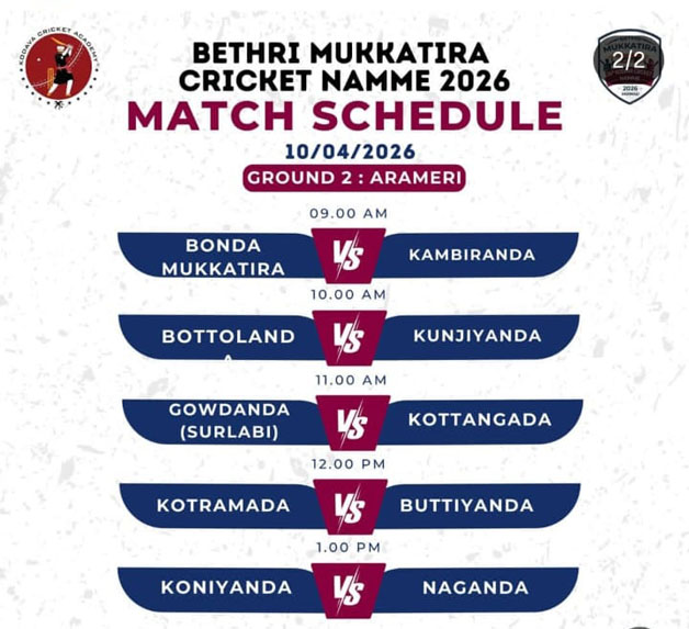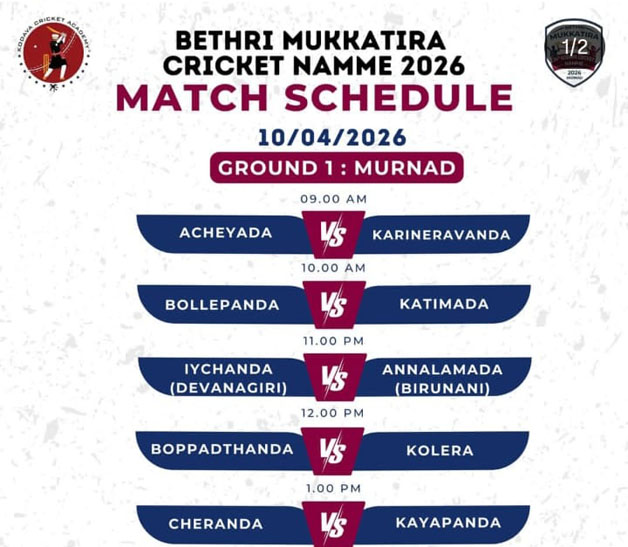 ಮಡಿಕೇರಿ ಏ.9 NEWS DESK : ಕೊಡವ ಕುಟುಂಬಗಳ ನಡುವೆ ಮೂರ್ನಾಡಿನಲ್ಲಿ ನಡೆಯುತ್ತಿರುವ 24ನೇ ವರ್ಷದ ‘ಬೇತ್ರಿ ಮುಕ್ಕಾಟಿರ ಕಪ್ ಕ್ರಿಕೆಟ್ ನಮ್ಮೆ’ ಯಲ್ಲಿ ಏ.10ರಂದು ಆಯೋಜಿಸಿರುವ ಪಂದ್ಯಗಳು. *ಮೈದಾನ 1* ಬೆಳಿಗ್ಗೆ 9 ಗಂಟೆಗೆ ಆಚೆಯಡ ಮತ್ತು ಕರಿನೆರವಂಡ, 10ಕ್ಕೆ ಬೊಳ್ಳೆಪಂಡ ಮತ್ತು ಕಾಟಿಮಾಡ, 11ಕ್ಕೆ ಐಚಂಡ (ದೇವಣಗೇರಿ) ಮತ್ತು ಅಣ್ಣಳಮಾಡ (ಬಿರುನಾಣಿ), ಮಧ್ಯಾಹ್ನ 12ಕ್ಕೆ ಬೊಪ್ಪಡ್ತಂಡ ಮತ್ತು ಕೋಳೆರ ಹಾಗೂ 1 ಗಂಟೆಗೆ ಚೇರಂಡ ಮತ್ತು ಕಾಯಪಂಡ *ಮೈದಾನ 2* ಬೆಳಿಗ್ಗೆ 9 ಗಂಟೆಗೆ ಬೋಂದ ಮುಕ್ಕಾಟಿರ ಮತ್ತು ಕಂಬೀರಂಡ, 10ಕ್ಕೆ ಬೊಟ್ಟೋಳಂಡ ಮತ್ತು ಕುಂಜಿಯಂಡ, 11ಕ್ಕೆ ಗೌಡಂಡ (ಸೂರ್ಲಬಿ) ಮತ್ತು ಕೊಟ್ಟಂಗಡ, ಮಧ್ಯಾಹ್ನ 12ಕ್ಕೆ ಕೊಟ್ರಮಾಡ ಮತ್ತು ಬುಟ್ಟಿಯಂಡ ಹಾಗೂ 1 ಗಂಟೆಗೆ ಕೋಣಿಯಂಡ ಮತ್ತು ನಾಗಂಡ